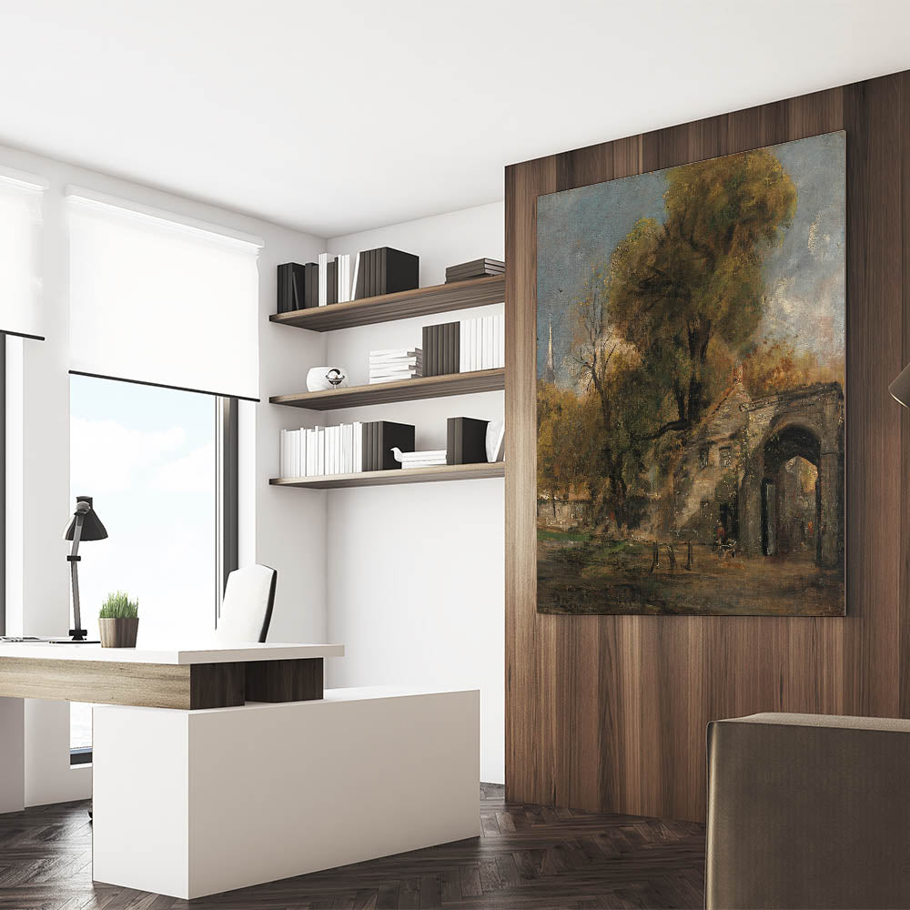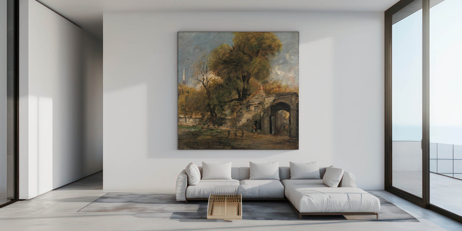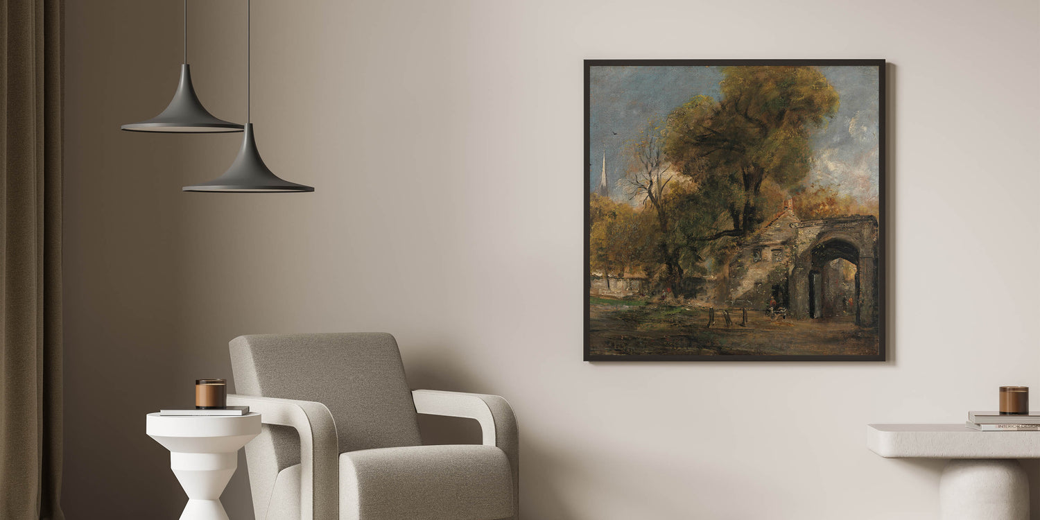 Bring the serene beauty of Romanticism into your home with Harnham Gate, Salisbury by John Constable. This masterpiece portrays a rustic gateway surrounded by lush foliage, a charming cottage, and the iconic Salisbury Cathedral spire peeking through the trees in the distance. Constable’s emotive brushstrokes and naturalistic color palette perfectly capture the timeless beauty of the English countryside.