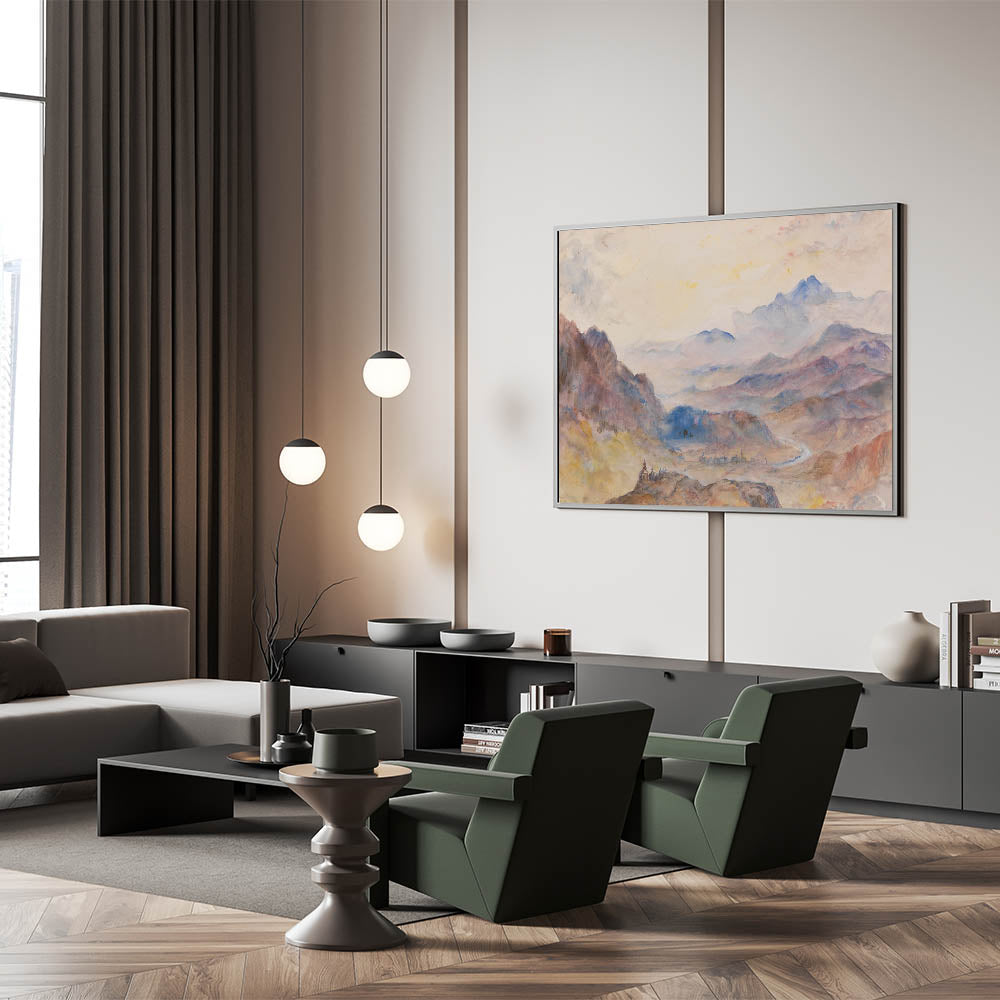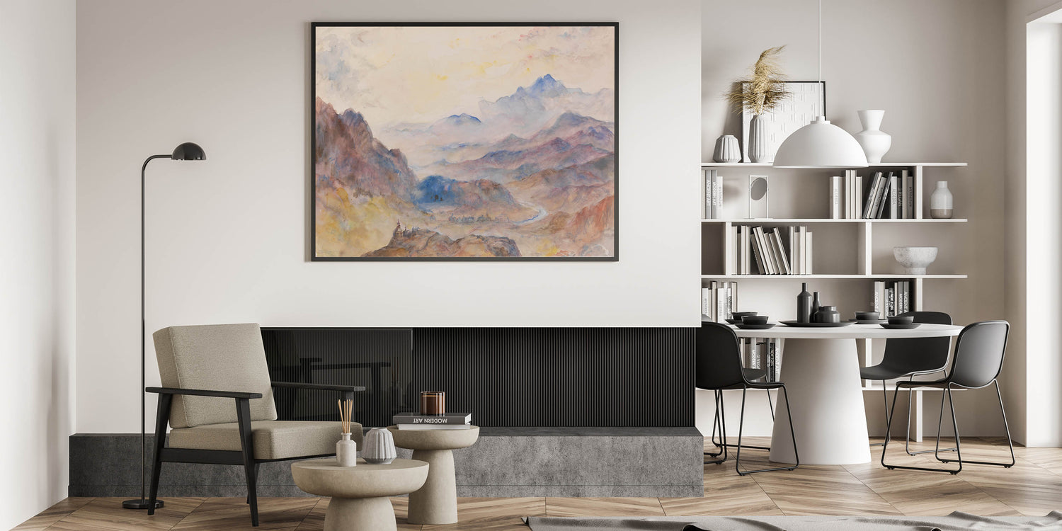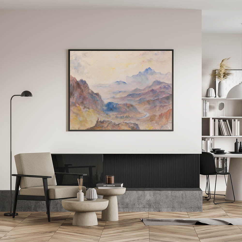 Step into the tranquil beauty of nature with "Mountain Scene, Mist Rising." This Romantic-era artwork captures a breathtaking view of a misty mountain landscape, blending soft hues of blue, purple, and gold to create a serene and dreamlike composition. The flowing river and distant peaks evoke a sense of calm and wonder, perfectly embodying the Romantic fascination with the sublime.