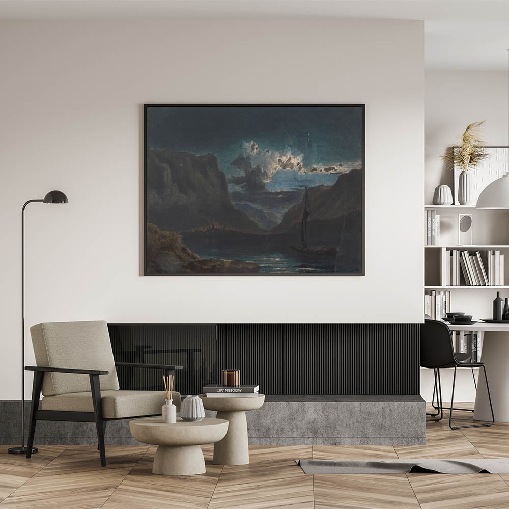 Capture the enchanting drama of Romanticism with New Weir on the Wye, a breathtaking landscape that illustrates the sublime beauty of nature at twilight. This masterpiece portrays a tranquil yet powerful riverscape, with towering cliffs, luminous clouds, and a lone boat navigating the serene waters. The striking interplay of light and shadow epitomizes Romanticism style wall art, evoking awe and deep emotion.