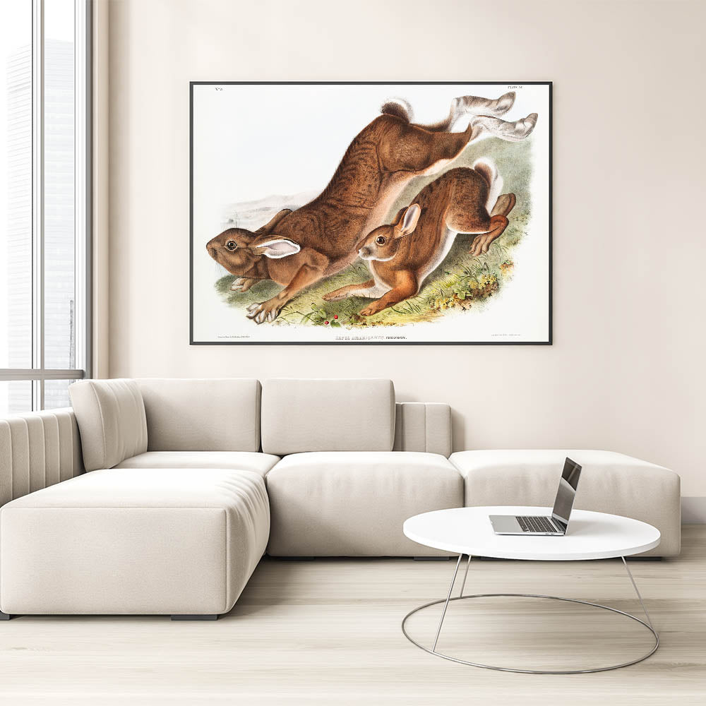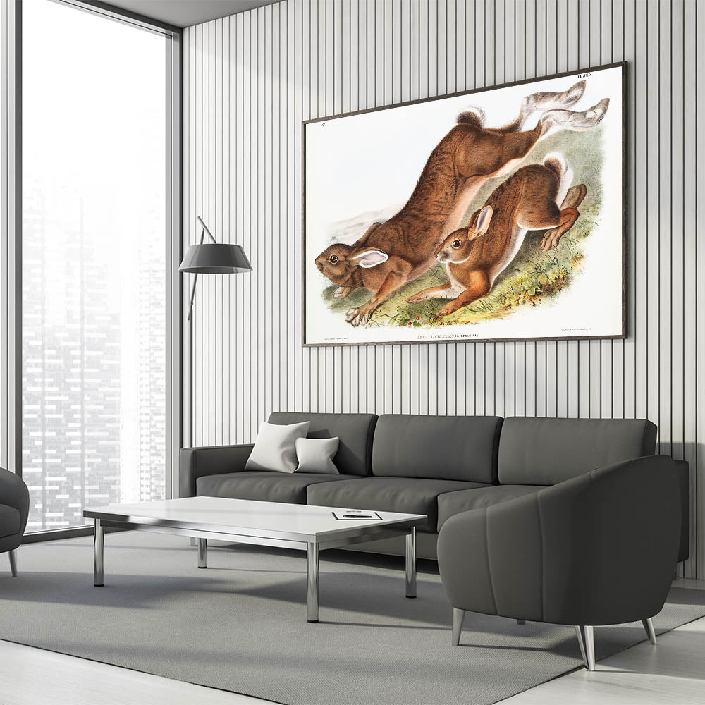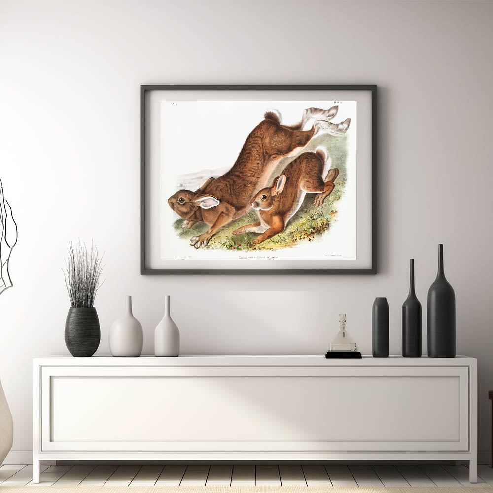 Add a touch of timeless charm to your space with this exquisite Romanticism-style wall art. Featuring "Northern Hares" by John Woodhouse Audubon, this artwork captures the lively movement and detail of these beautiful creatures in their natural habitat. The perfect blend of emotional landscapes and classic Romantic art, this piece will elevate your home decor with its historic and cultural essence.