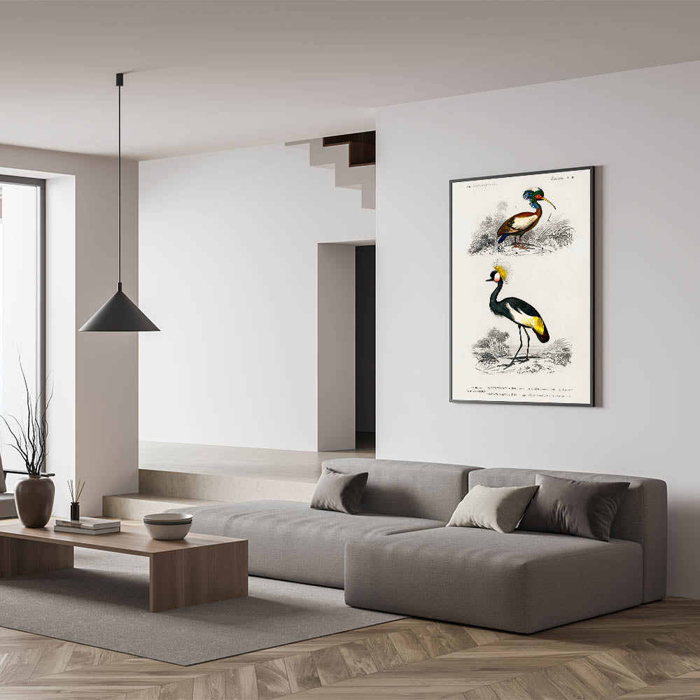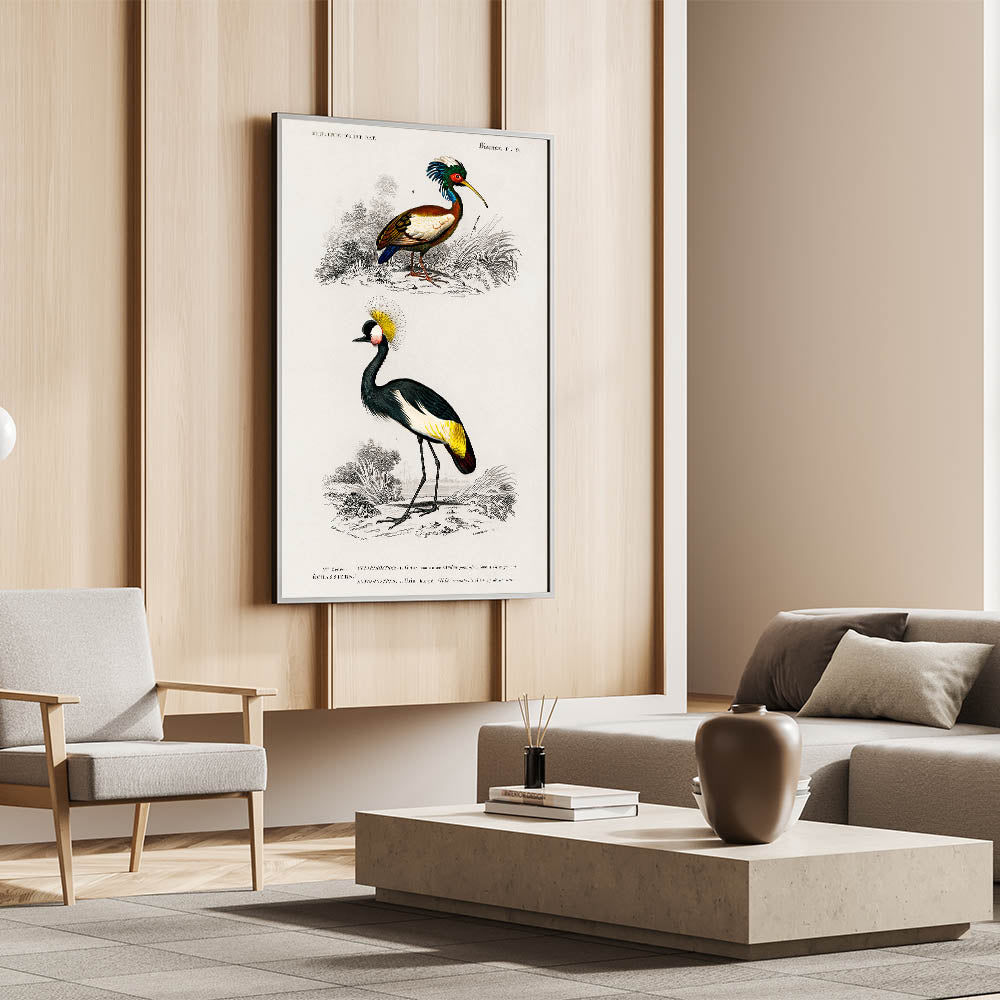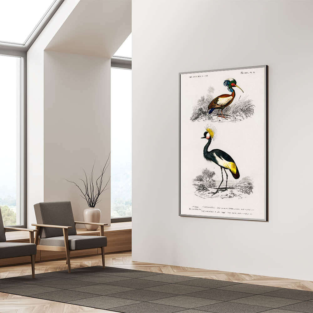Celebrate the beauty of avian life with this stunning Romanticism-inspired artwork, "Different Types of Birds," illustrated by Charles Dessalines D’Orbigny. This detailed piece features a crowned crane (Grue couronnée) and a crested ibis (Ibis huppé), showcasing their vibrant plumage and elegant postures. The fine artistry and intricate detailing reflect the Romantic era's dedication to celebrating nature’s splendor through art.