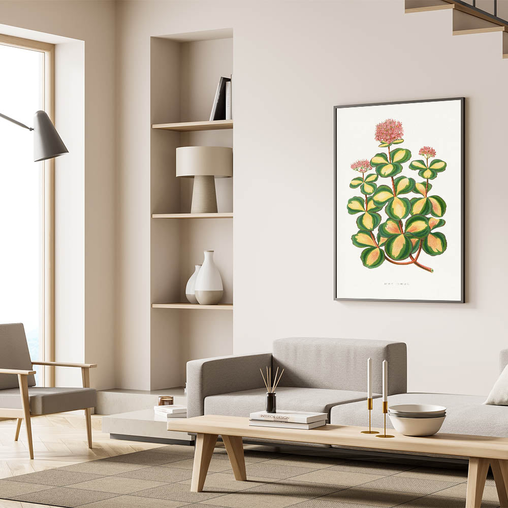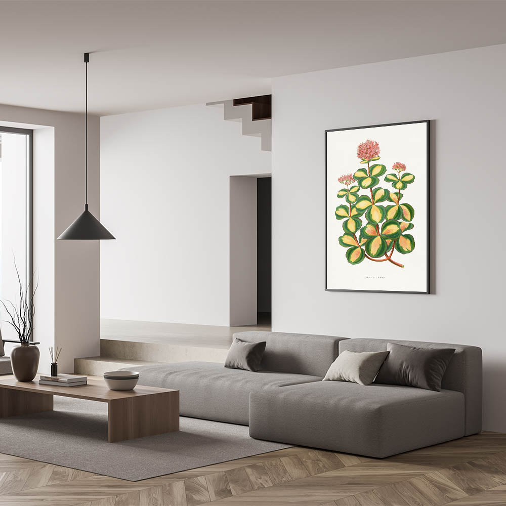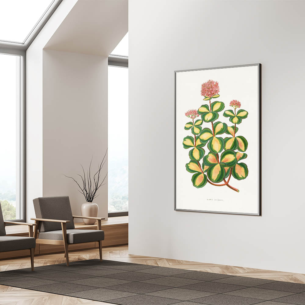 Enhance your space with the elegance of Romanticism style wall art through this stunning illustration of the Stonecrop (Sedum sieboldii). Created by Alexander Francis Lydon and Benjamin Fawsett for the 1865 edition of Les Plantes à Feuillage Coloré, this piece exemplifies the Romantic era’s admiration for the intricate beauty of nature. The vibrant greens and yellows of the Stonecrop’s leaves are complemented by delicate pink blossoms, creating a harmonious blend of botanical precision and artistic grace.