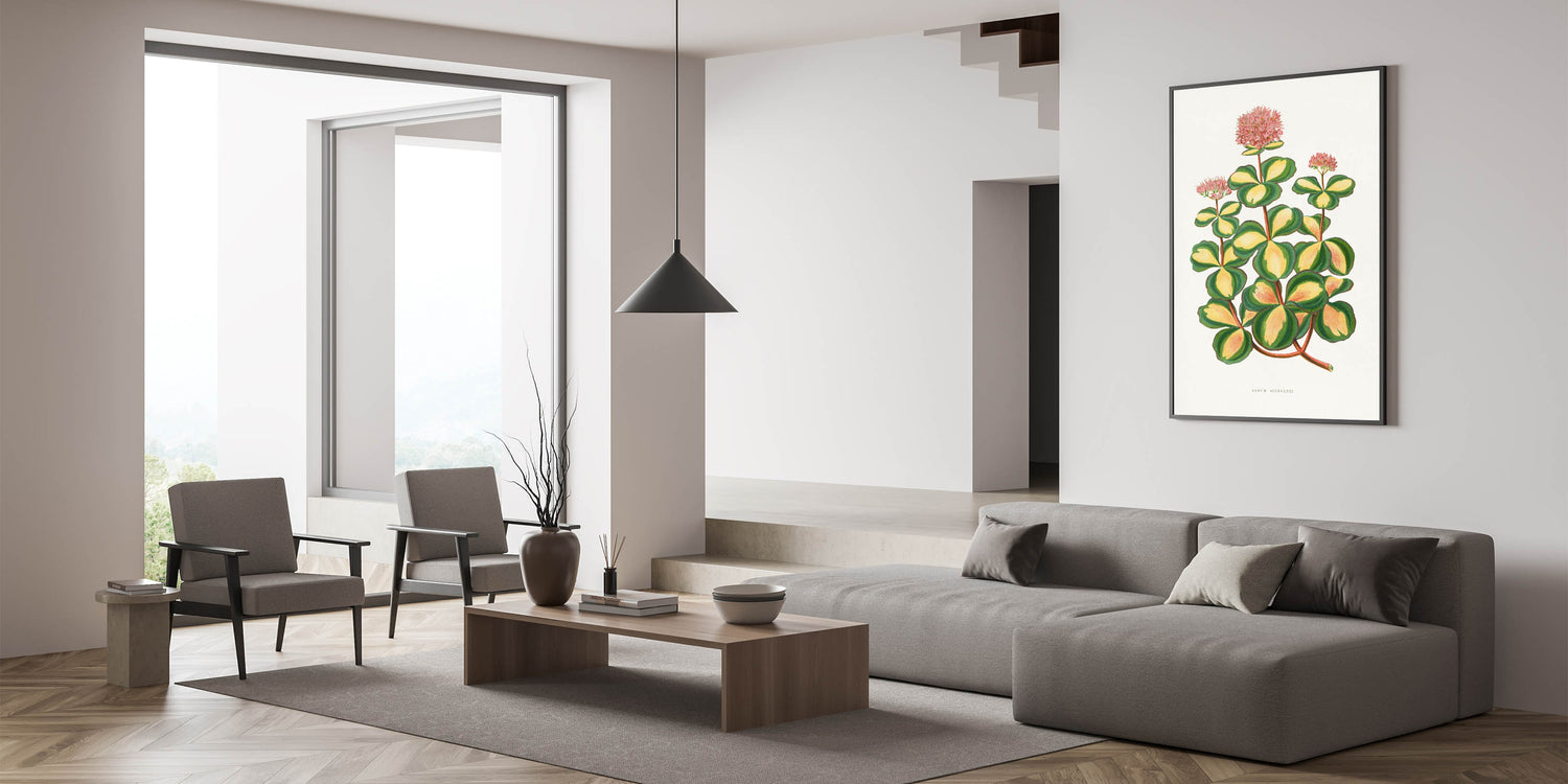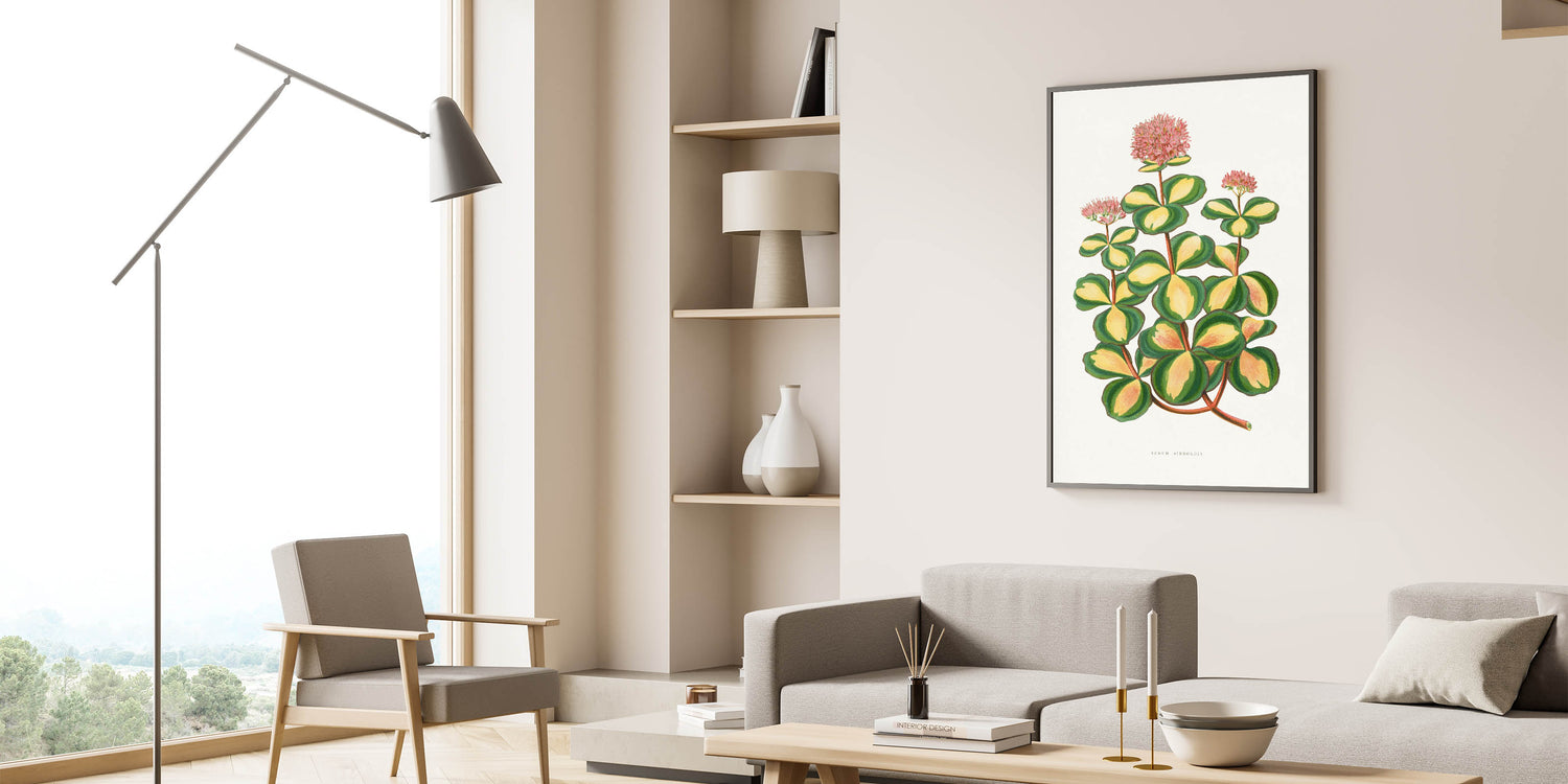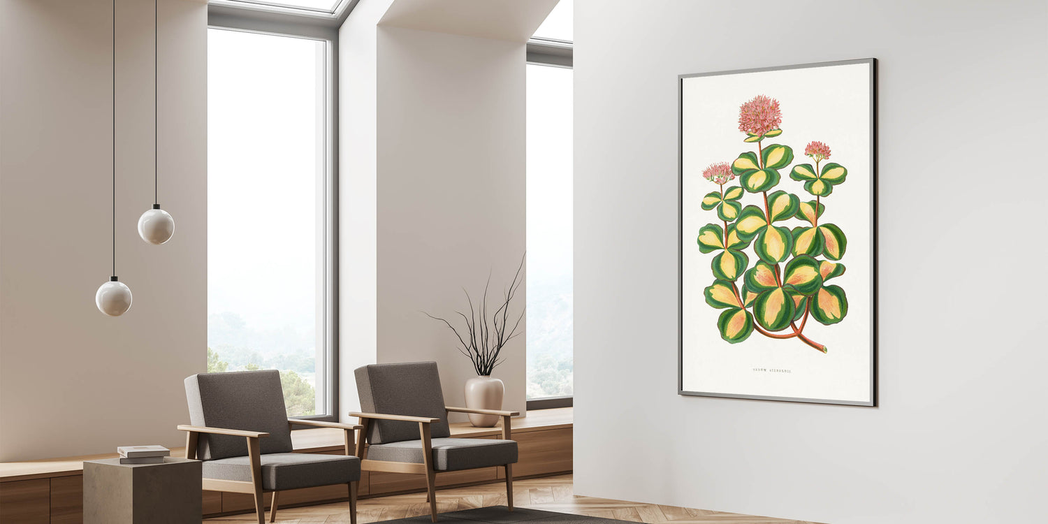 Enhance your space with the elegance of Romanticism style wall art through this stunning illustration of the Stonecrop (Sedum sieboldii). Created by Alexander Francis Lydon and Benjamin Fawsett for the 1865 edition of Les Plantes à Feuillage Coloré, this piece exemplifies the Romantic era’s admiration for the intricate beauty of nature. The vibrant greens and yellows of the Stonecrop’s leaves are complemented by delicate pink blossoms, creating a harmonious blend of botanical precision and artistic grace.