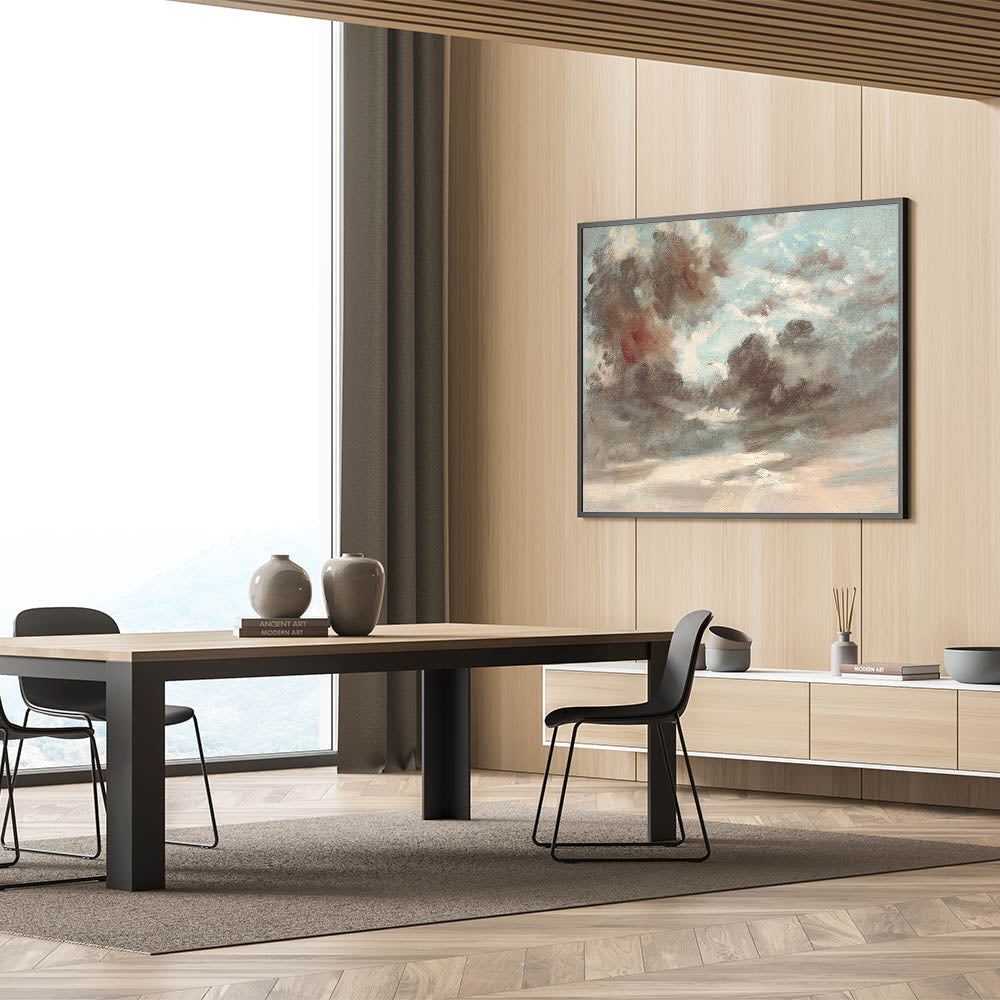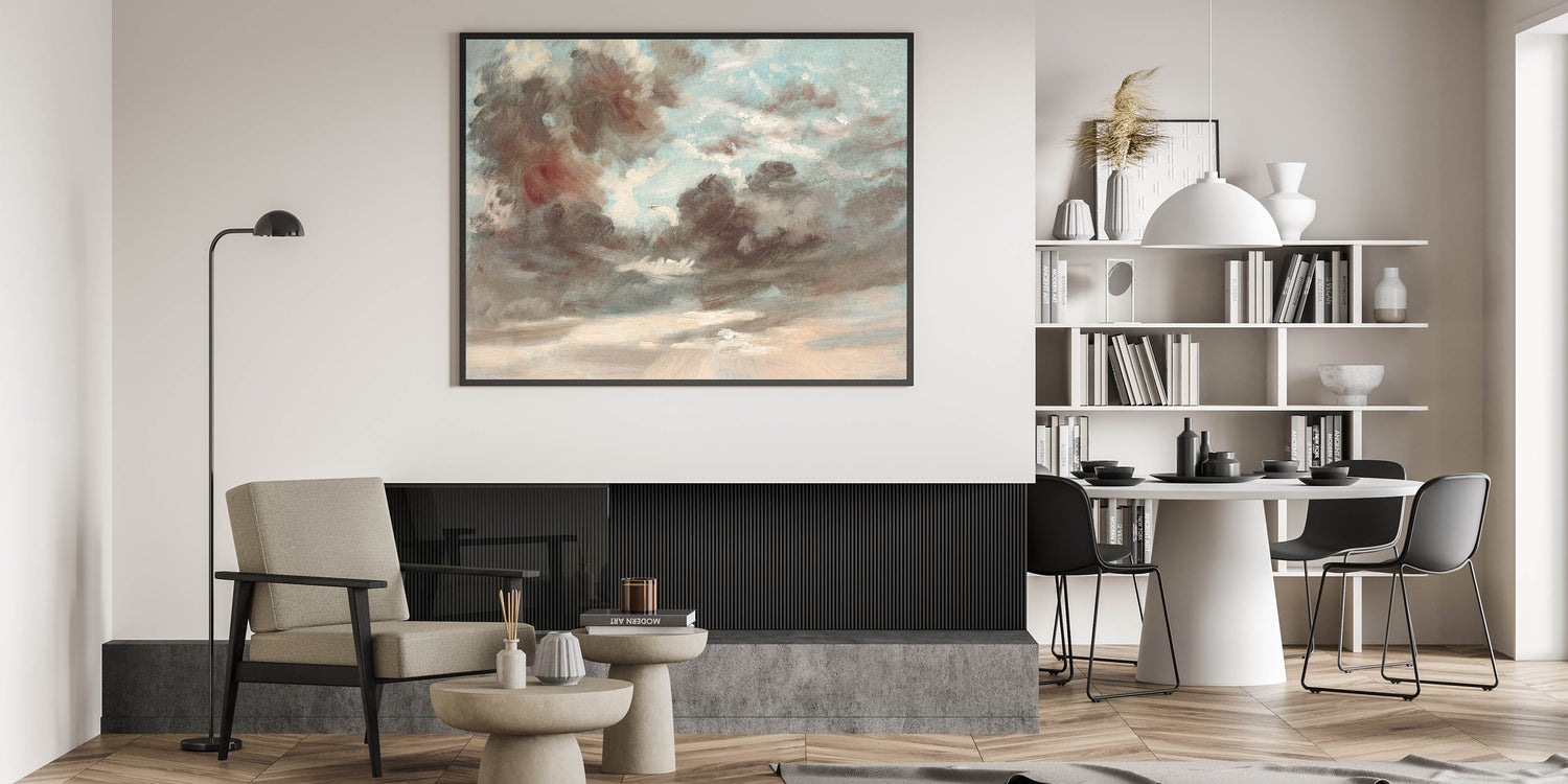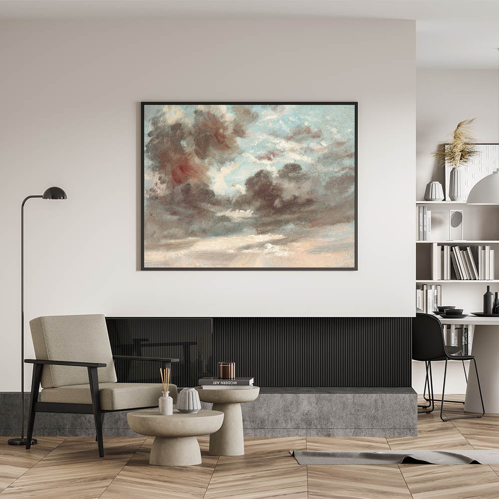 Bring the dramatic beauty of Romanticism style wall art into your home with "Cloud Study: Stormy Sunset" by John Constable (1821-1822). This masterpiece captures the awe-inspiring interplay of light and shadow in the sky, reflecting the emotional depth and sublime power of nature, a hallmark of the Romantic era. Constable’s loose brushwork and attention to atmospheric detail make this artwork a stunning representation of classic Romantic paintings.