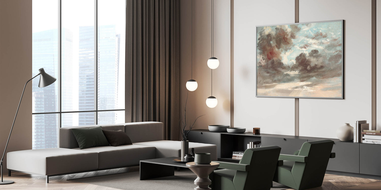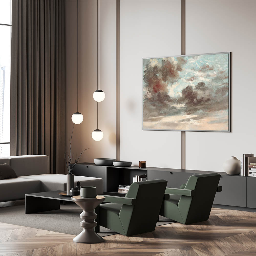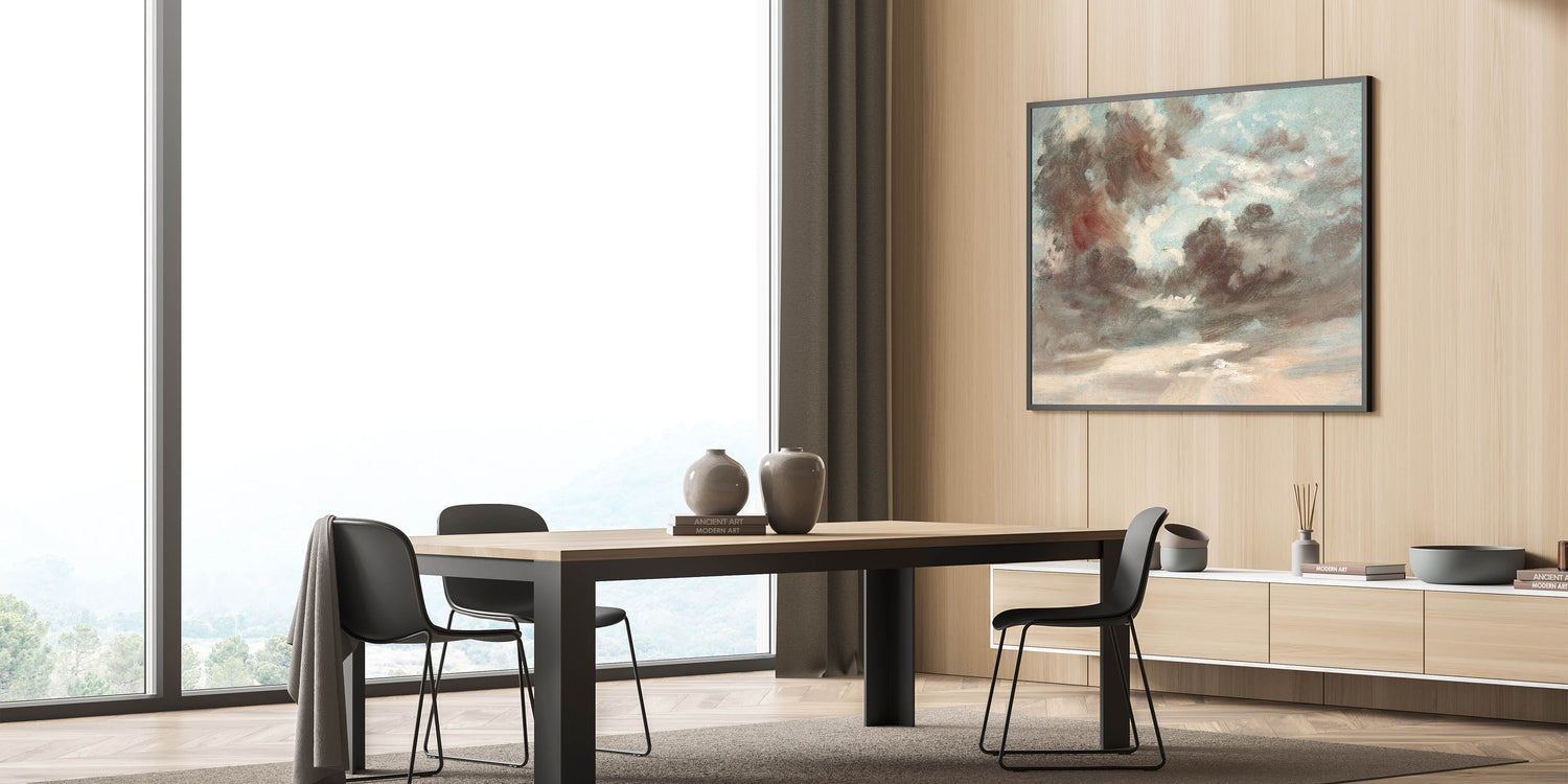 Bring the dramatic beauty of Romanticism style wall art into your home with "Cloud Study: Stormy Sunset" by John Constable (1821-1822). This masterpiece captures the awe-inspiring interplay of light and shadow in the sky, reflecting the emotional depth and sublime power of nature, a hallmark of the Romantic era. Constable’s loose brushwork and attention to atmospheric detail make this artwork a stunning representation of classic Romantic paintings.