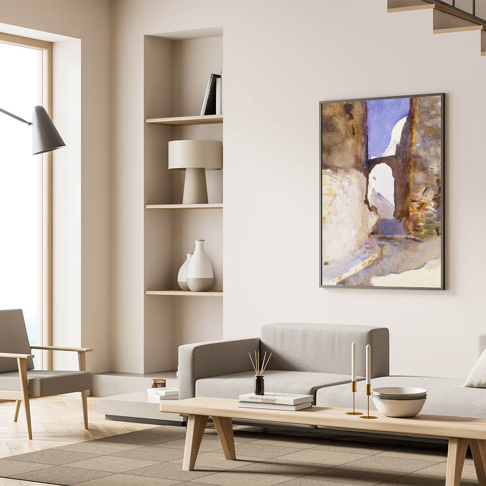 Experience the beauty of Romanticism with Street, Tangier (1895) by John Singer Sargent. This atmospheric watercolor captures a narrow street bathed in soft light, with its weathered walls and an arched gateway leading to an inviting expanse of sky. Sargent’s masterful use of color and texture evokes the vibrant yet tranquil essence of Moroccan architecture and landscapes, a hallmark of Romanticism style wall art.