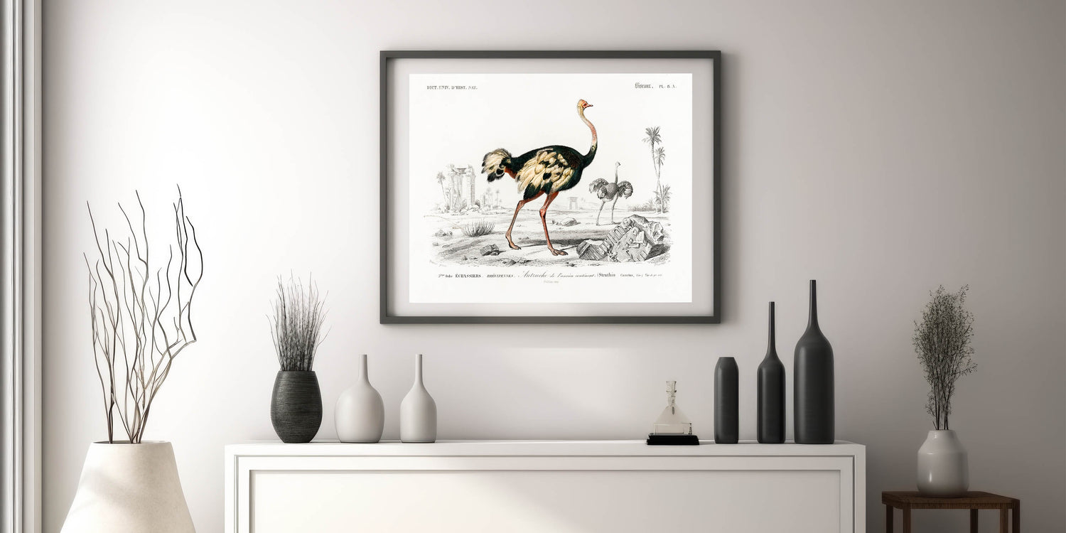 This classic art of the Romantic era is ideal for nature enthusiasts, history lovers, or those seeking unique, elegant decor. The vibrant tones of the ostrich’s plumage and the subtle details of the background create a visually striking piece that complements a variety of interior styles.