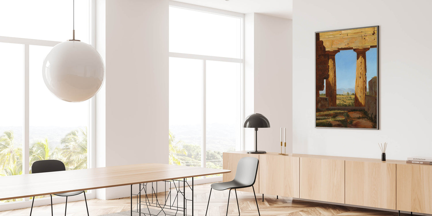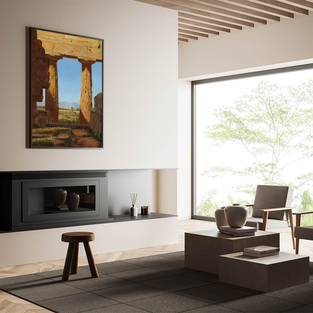 Step back into the ancient world with Columns of the Temple of Neptune at Paestum by Constantin Hansen. This Romantic-era masterpiece captures the ruins of an iconic Greek temple, framed by the golden light of the Italian countryside. The vibrant blue sky contrasts with the aged stone, offering a powerful visual of time’s passage and the enduring beauty of classical architecture.