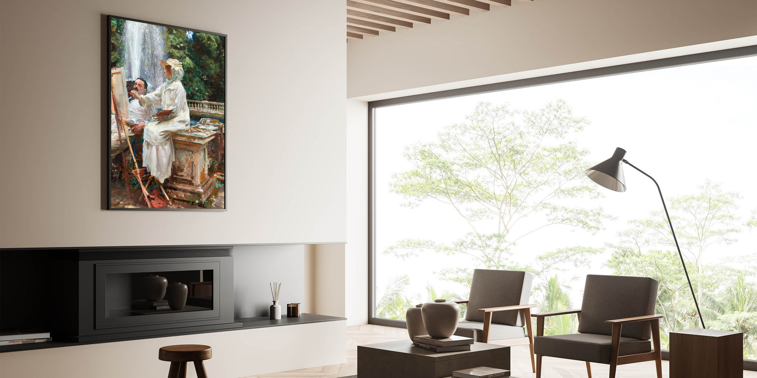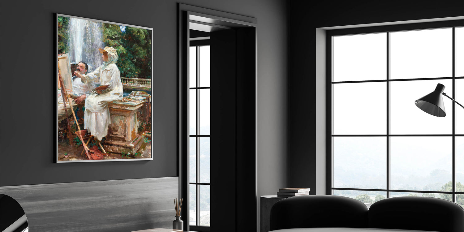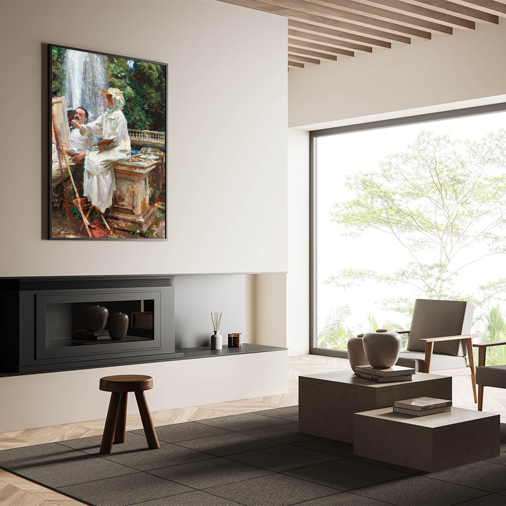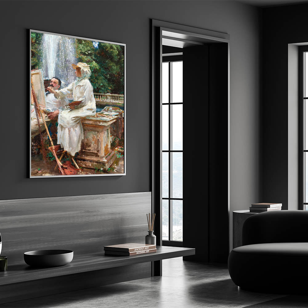 Step into a serene moment of artistic creation with The Fountain, Villa Torlonia, Frascati, Italy (1907) by John Singer Sargent. This beautiful piece of Romanticism style wall art captures an idyllic outdoor scene where nature and artistry blend harmoniously. Featuring an artist and model by a cascading fountain, surrounded by lush greenery and classical architecture, the painting embodies the charm and sophistication of the classic art of the Romantic era.