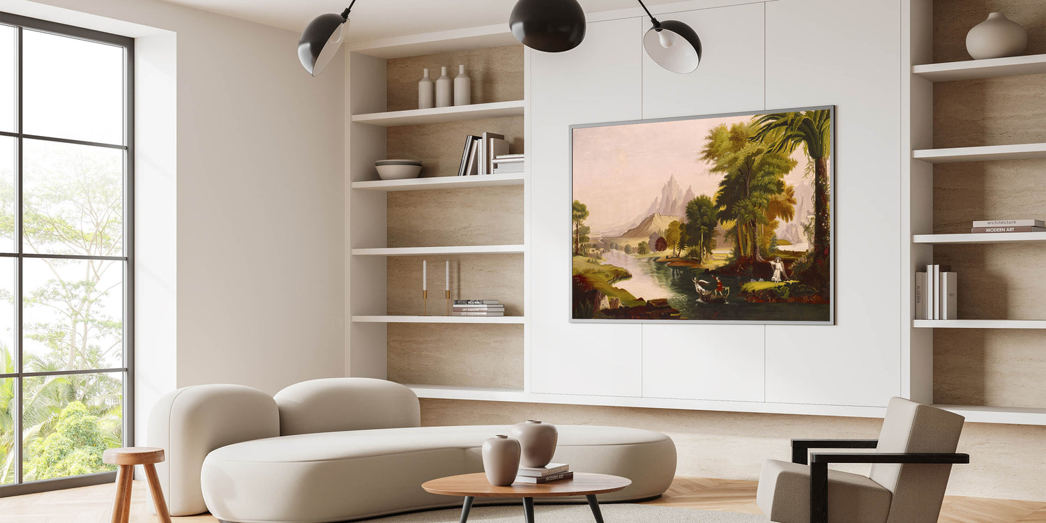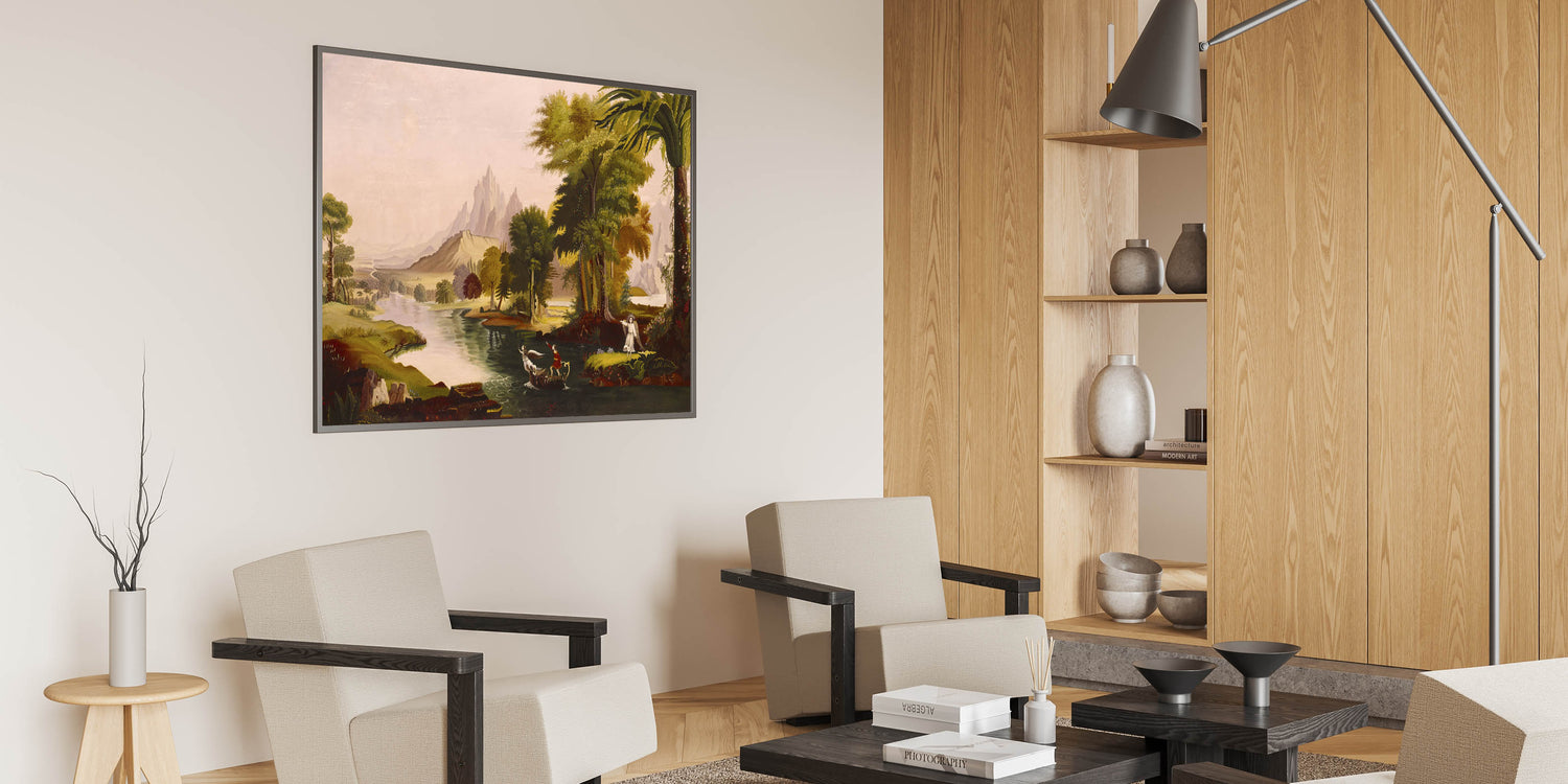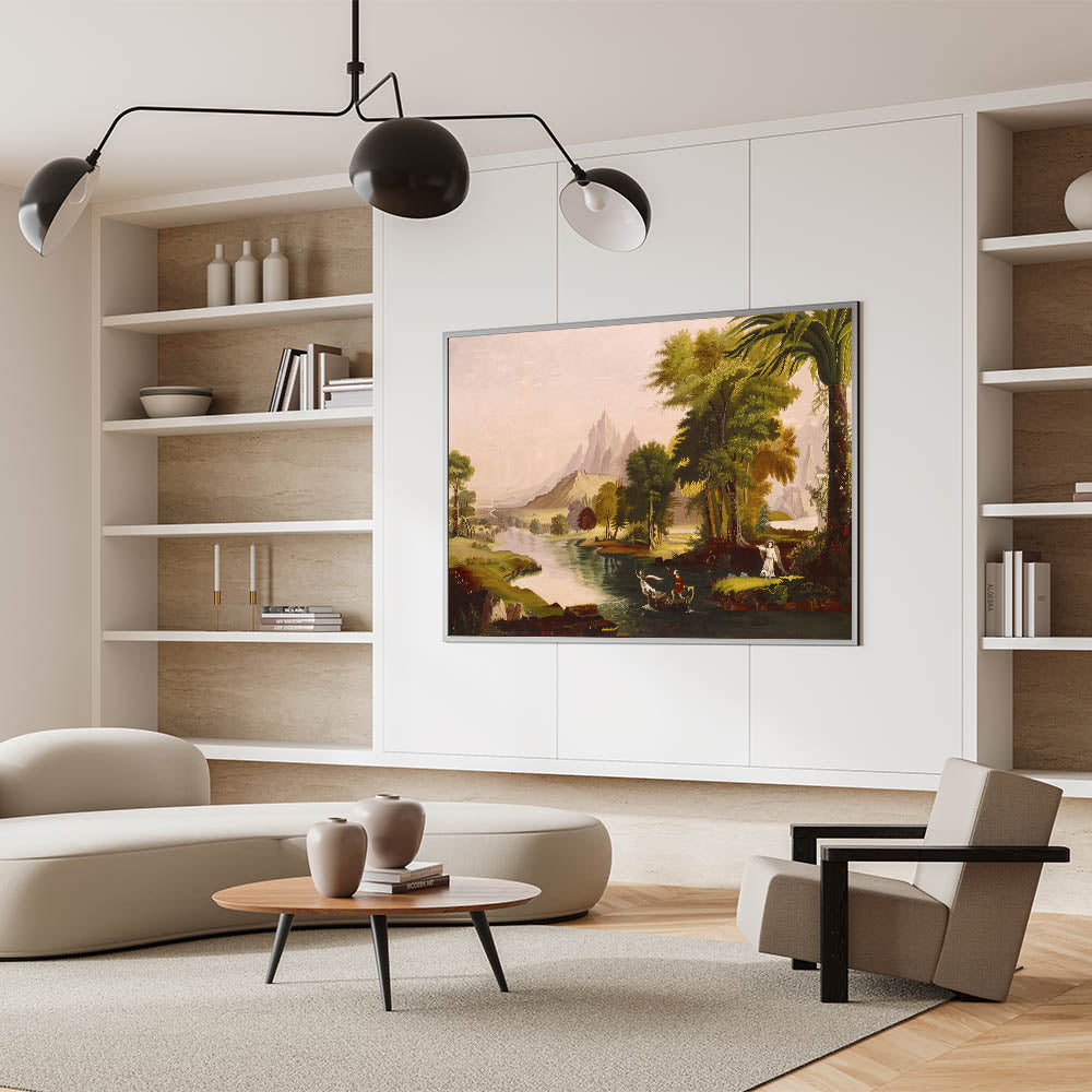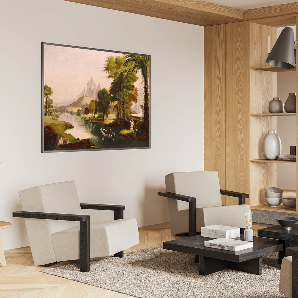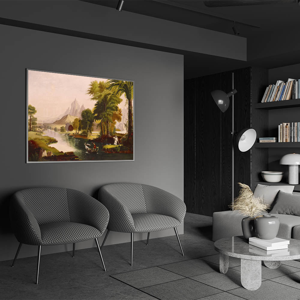 Step into the enchanting world of Romanticism with Thomas Cole’s masterpiece, The Voyage of Life - Youth. This breathtaking artwork is part of Cole’s iconic series, illustrating the journey of life through symbolic landscapes. Youth captures the optimism and adventurous spirit of life’s early stages, with vivid colors and dramatic scenery that inspire awe and reflection. The intricate details, lush greenery, and majestic mountains embody the Romantic era’s fascination with nature and human emotion.