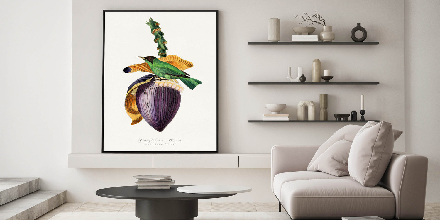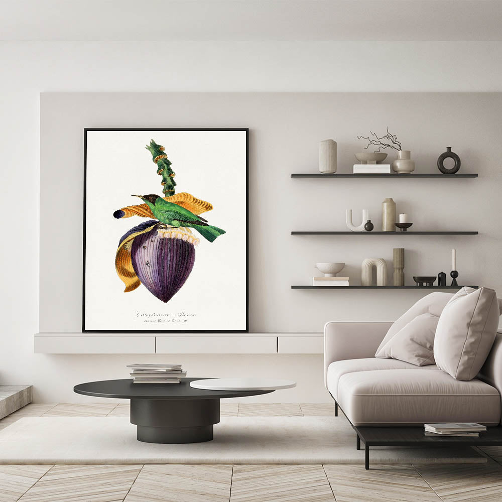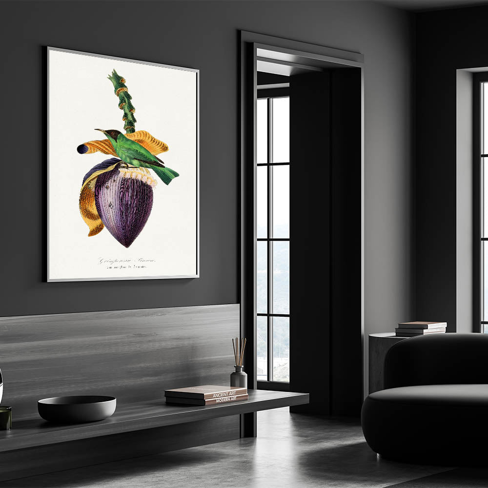 Celebrate the beauty of nature and the Romanticism era with Treecreeper Bird on Banana Flower, from the 1842 edition of Le Jardin Des Plantes by Paul Gervais. This exquisite artwork features the vibrant Treecreeper bird perched on a striking banana flower, rendered with incredible detail and emotion. The rich colors and harmonious composition embody the Romanticism style wall art, emphasizing the connection between nature and art.