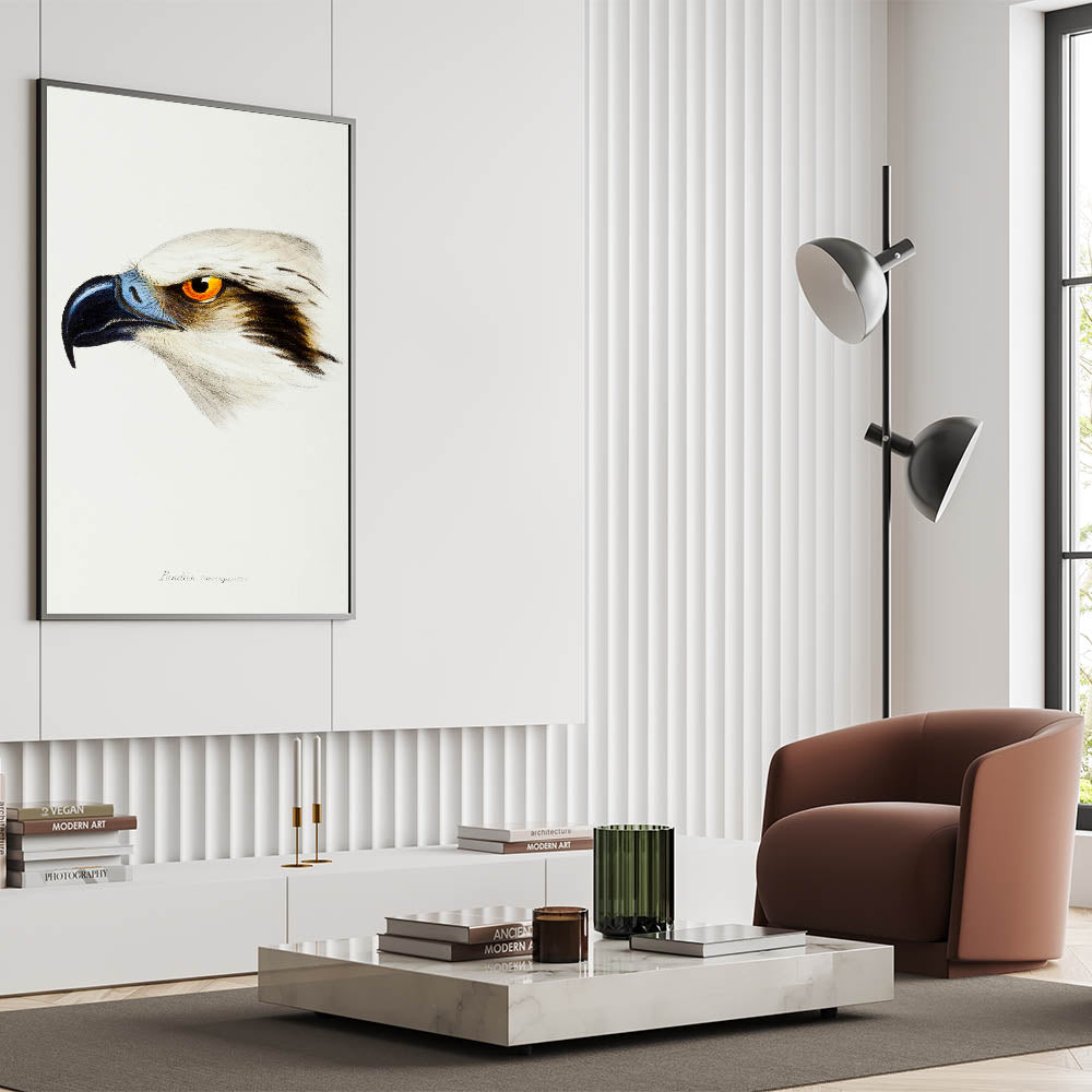 This exquisite illustration of the White-Headed Osprey (Pandion leucocephalus) celebrates the Romanticism art style's fascination with the natural world. Capturing the intensity and grace of this majestic bird, the artwork features striking details, from the piercing orange eye to the textured feathers and bold beak. This piece reflects the timeless elegance of Romantic-era wildlife studies, making it an ideal addition to your art collection or home decor.