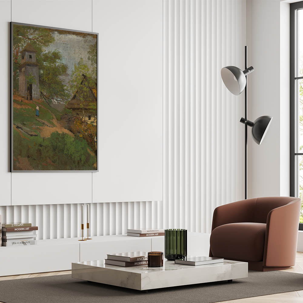 Transform your living space with this evocative Romanticism style wall art showcasing a charming depiction of a wooden belfry and rustic countryside by László Mednyánszky. This piece reflects the serene beauty and emotional depth of the classic art of the Romantic era, emphasizing humanity's connection to nature and tradition.