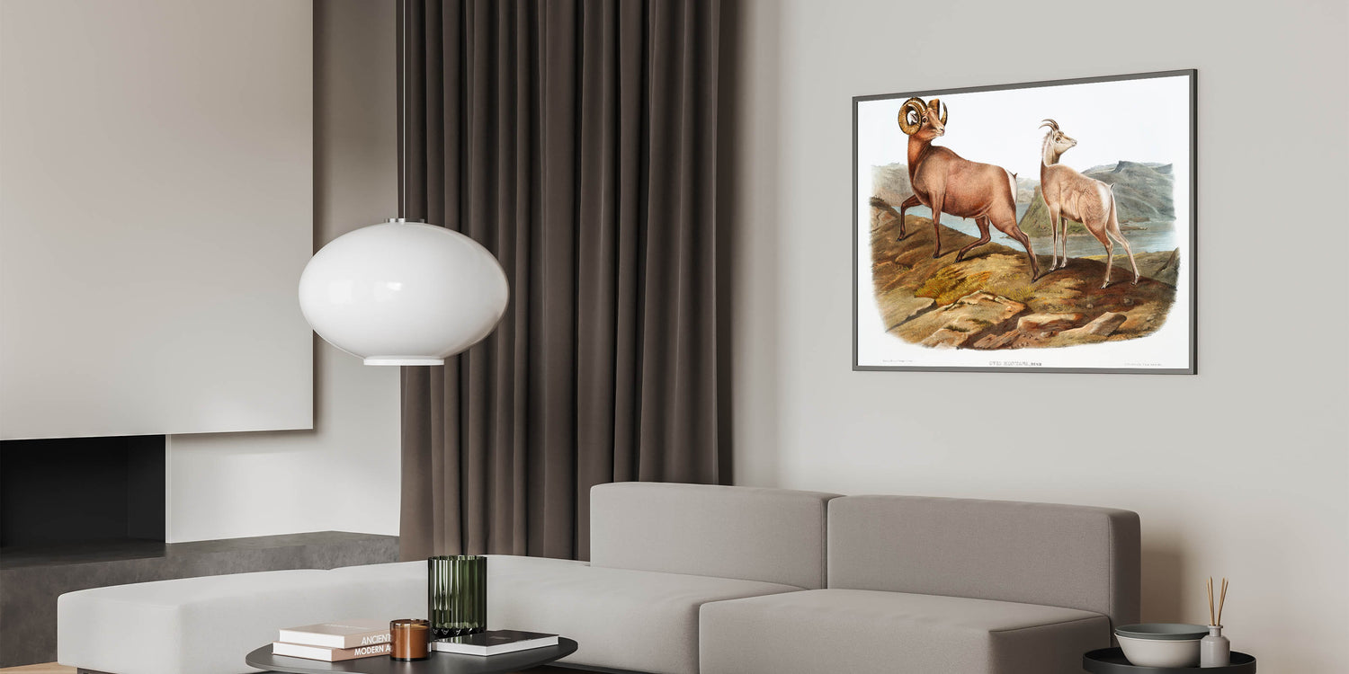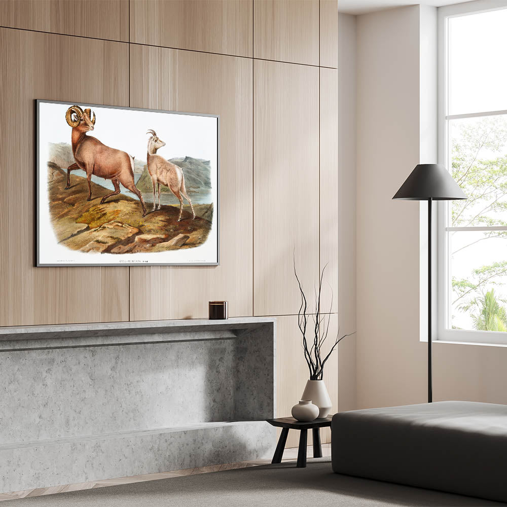 Celebrate the natural elegance of the Romantic era with Rocky Mountain Sheep (Ovis Montana), illustrated by John Woodhouse Audubon in 1845. This exquisite artwork from The Viviparous Quadrupeds of North America captures the strength and grace of these majestic animals amidst a rugged mountainous landscape. The finely detailed composition reflects the Romantic movement’s reverence for the natural world and its timeless beauty.