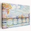 Bring the charm of Paris into your home with this modern wall art, featuring a stunning pointillist depiction of a bridge over the Seine. Painted in vibrant hues of blue, yellow, pink, and green, this artwork captures the beauty and elegance of a Parisian autumn, with trees lining the riverbank and a clear sky above. Perfect for trendy home decor, this unique modern art piece adds sophistication and a touch of classic French style to any room.