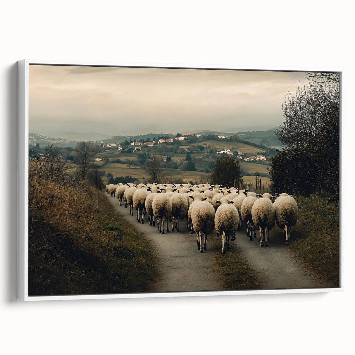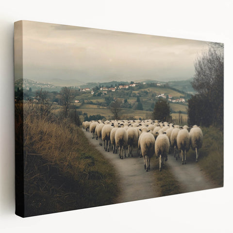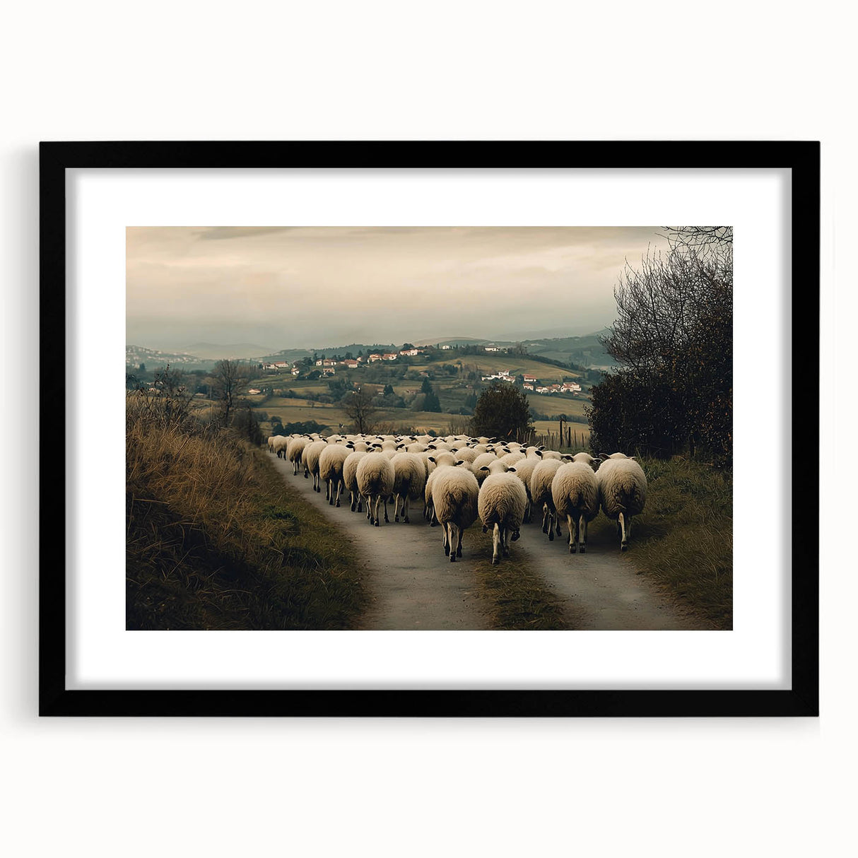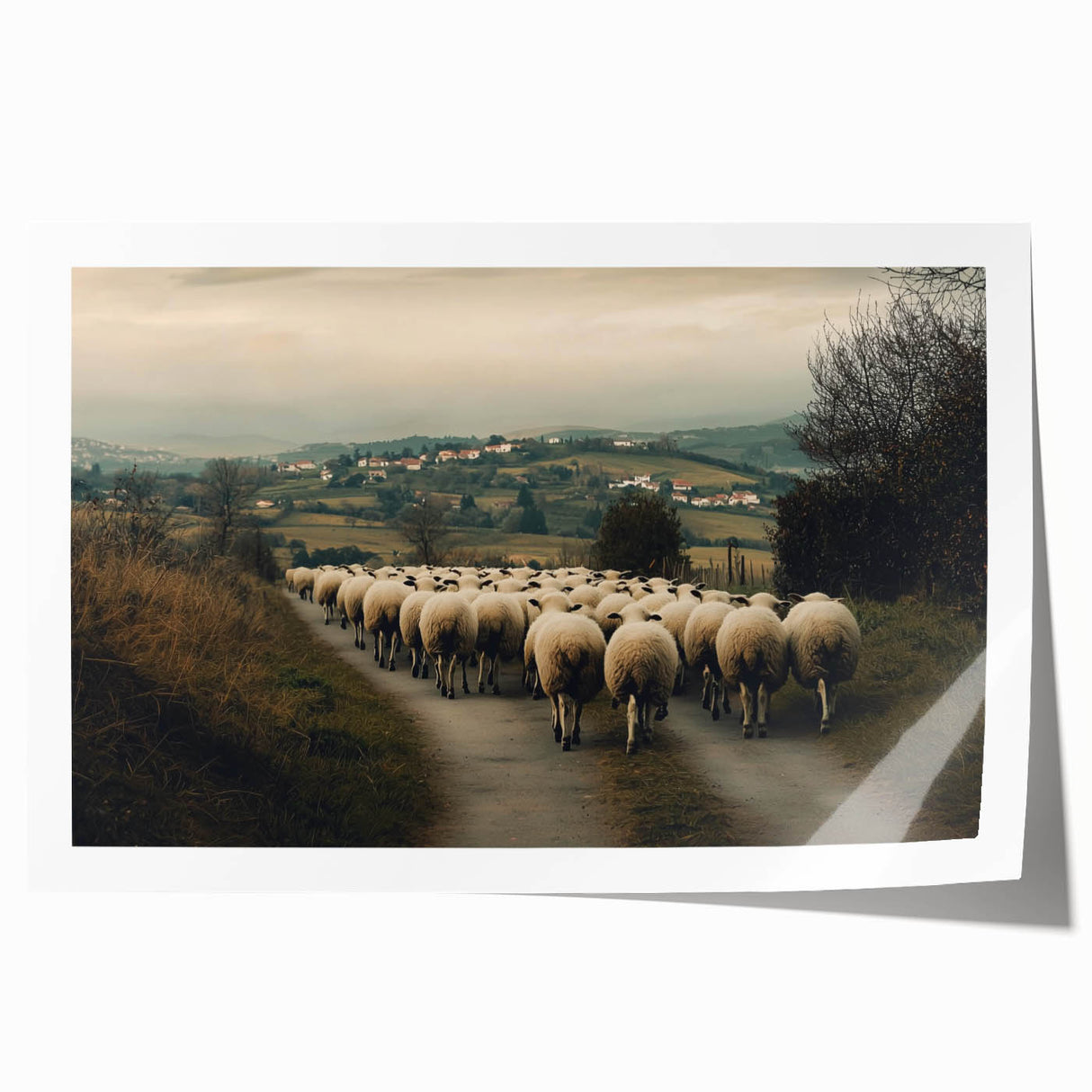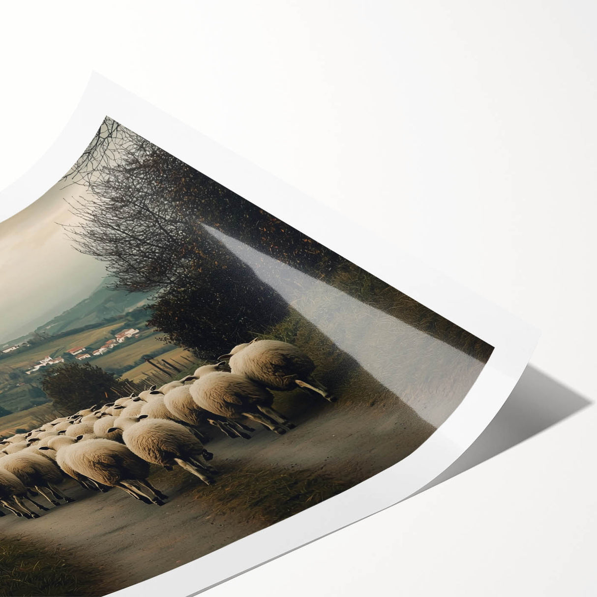 Immerse yourself in the pastoral charm of the countryside with this stunning Scenic Countryside Print featuring a herd of sheep walking along a rustic pathway, surrounded by lush greenery and rolling hills. This artwork brings the tranquil essence of rural life into your home, creating a warm and inviting atmosphere.