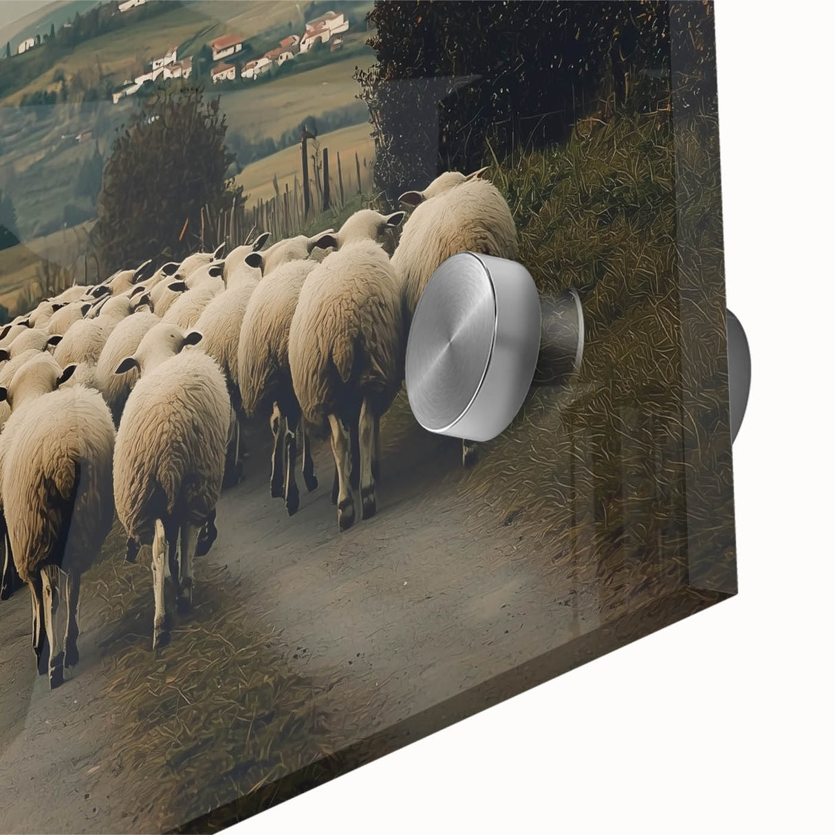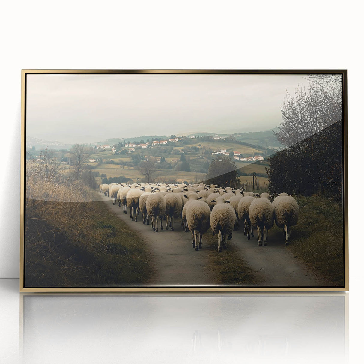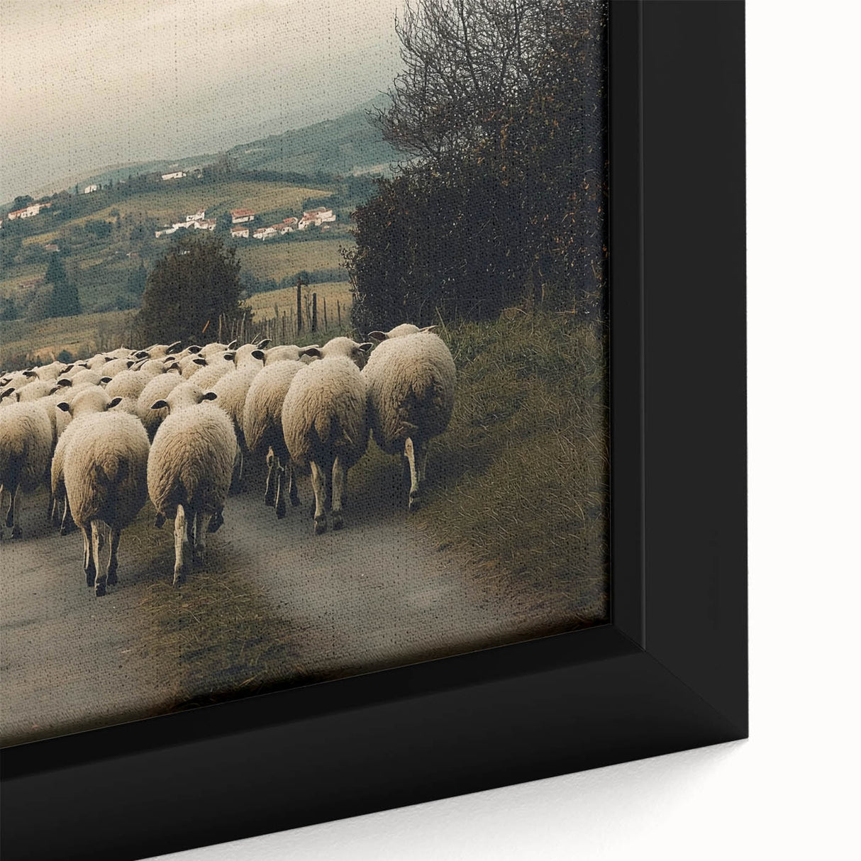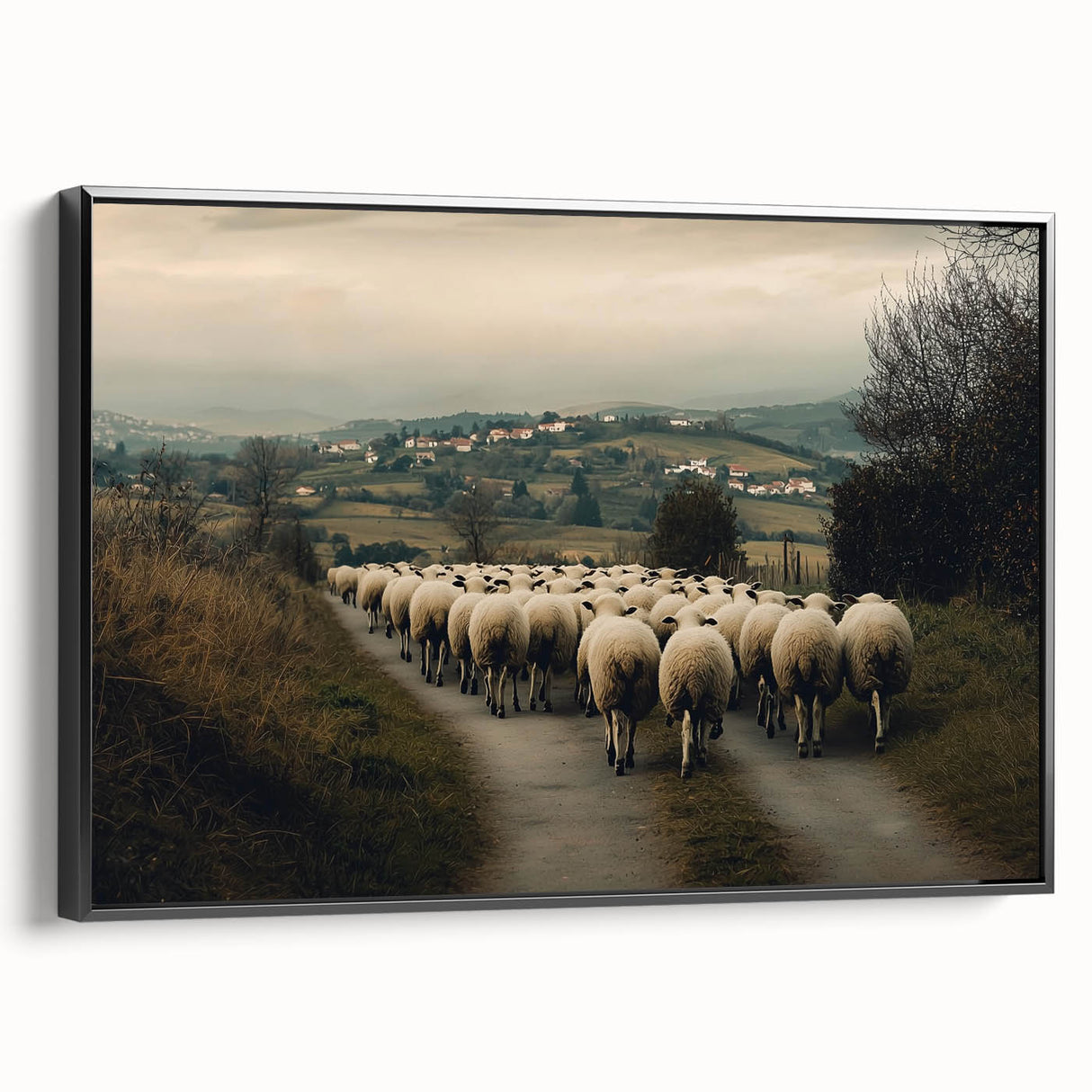 Immerse yourself in the pastoral charm of the countryside with this stunning Scenic Countryside Print featuring a herd of sheep walking along a rustic pathway, surrounded by lush greenery and rolling hills. This artwork brings the tranquil essence of rural life into your home, creating a warm and inviting atmosphere.