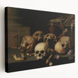 Immerse yourself in the depths of Dark Academia with this haunting still life featuring a collection of skulls, bones, and a single flickering candle. This piece evokes themes of mortality and knowledge, making it a quintessential example of vintage Gothic prints. The dark background and the soft glow from the candle emphasize the eerie beauty of the skulls, while the scattered bones and aged documents in the background add layers of narrative intrigue. Perfect for lovers of classic literature art, this piece embodies a sense of history and contemplation, making it ideal for creating an intellectual and moody atmosphere.