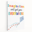 Inspire creativity and curiosity with this Imagination Inspirational Wall Art. Featuring the uplifting quote, "Imagination will get you everywhere," in a playful and colorful design, this Kids Educational Wall Art serves as a daily reminder for children to dream big. The whimsical kite illustration adds a fun, airy touch, making it a perfect Children’s Learning Art Print for playrooms, classrooms, and nurseries.