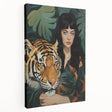 Make a daring statement in your home with this unique electric artwork that features a powerful portrayal of a woman alongside a majestic tiger. This bright and dynamic wall art captures the intensity of their connection, surrounded by lush tropical leaves. The contrasting colors and bold lines bring the scene to life, creating an eye-catching electric design that is perfect for modern and eclectic spaces.