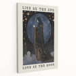 Add a touch of cosmic elegance to your space with this unique electric artwork featuring a mystical figure under the moonlit sky. This bright and dynamic wall art captures the phrase "Live by the Sun, Love by the Moon," emphasizing a celestial theme with intricate details of stars, the moon, and the robed goddess. The deep blues, gold accents, and stunning design make it a perfect piece for anyone who loves spiritual or cosmic art.
