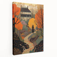 Embrace the beauty of the autumn season with this captivating electric wall art, featuring a serene landscape with vibrant orange and gold trees, and a shadowy figure walking along a winding path. The deep, rich colors of the foliage paired with the tranquil house in the background create a peaceful and eye-catching electric design. The use of contrasting colors and the minimalist silhouette add a layer of mystery and elegance to this vibrant art print.