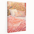Transform your home with this unique electric artwork that combines fine details with vibrant tones. The ruffled pink bedding and intricately designed headboard add a touch of charm while maintaining a bold, eye-catching aesthetic perfect for contemporary spaces.