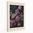 Introduce a sense of elegance and inspiration to your space with this unique electric artwork, featuring a lush dark floral composition paired with the phrase "Your Words Spark Wonder." This bright and dynamic wall art captures the beauty of blooming flowers in deep hues of purple, pink, and cream, set against a striking black background. The inspirational text adds a meaningful touch, making it perfect for modern interiors that blend art and mindfulness.