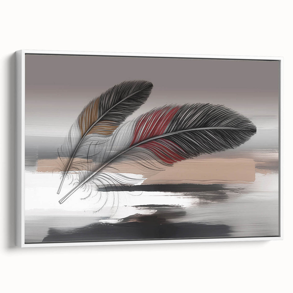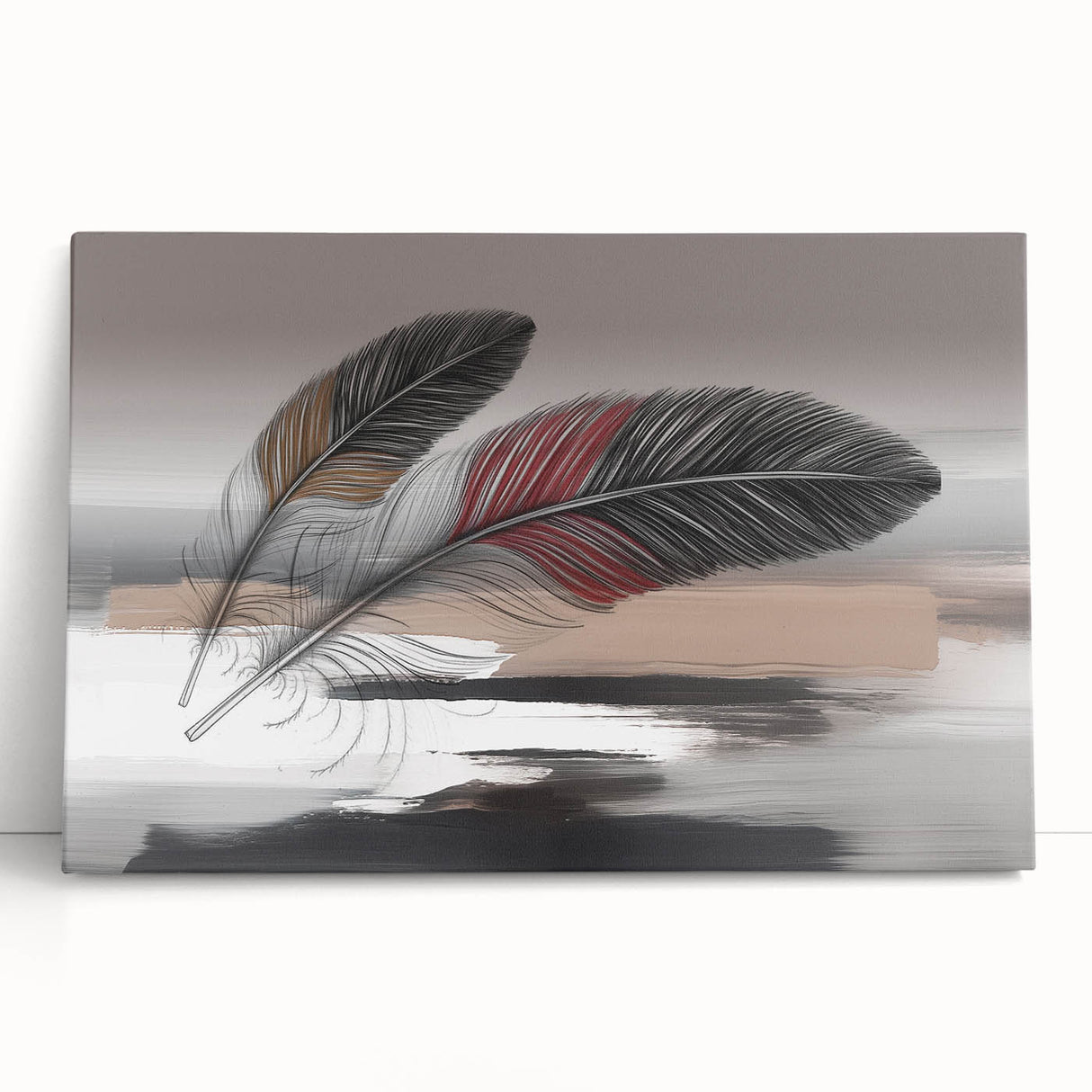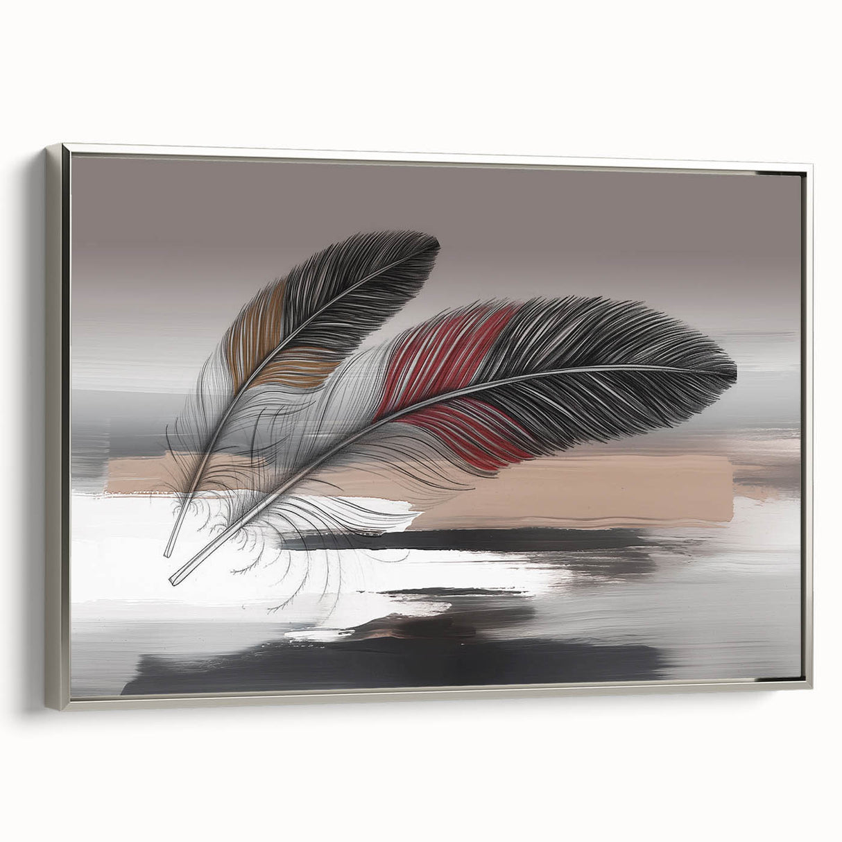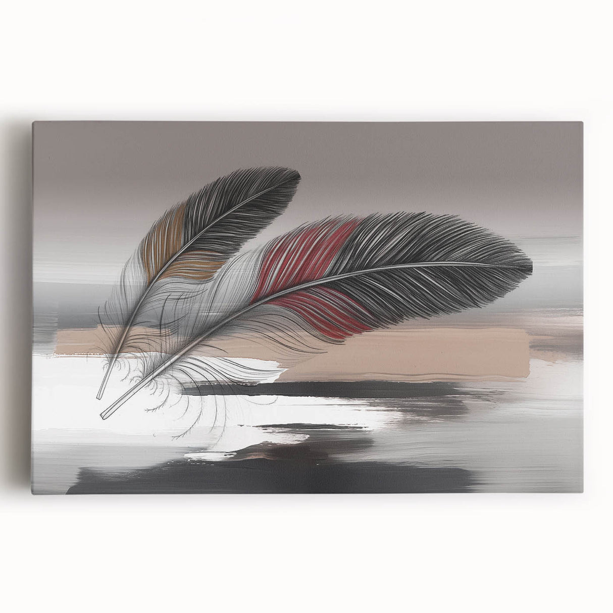 Add a touch of elegance and sophistication to your space with this beautifully detailed abstract feather artwork. Featuring two intricately designed feathers with rich red and brown accents, set against a soft grey and beige background, this piece exudes a sense of calm and refinement. The delicate strokes and subtle color transitions create a harmonious composition that enhances any room's aesthetic.