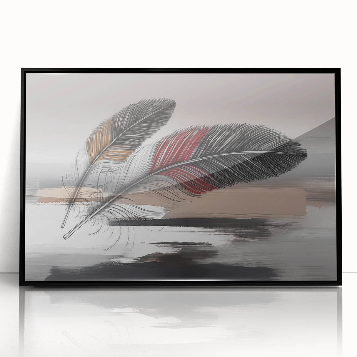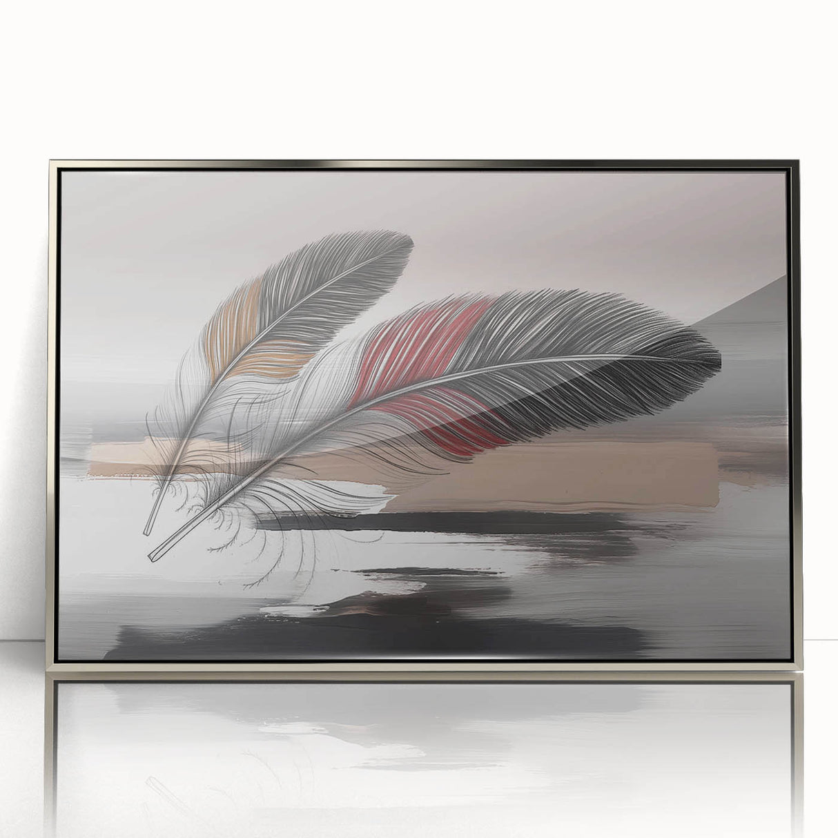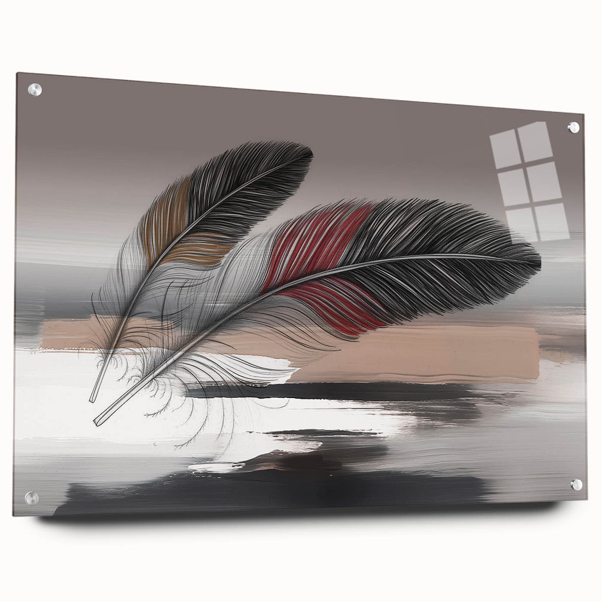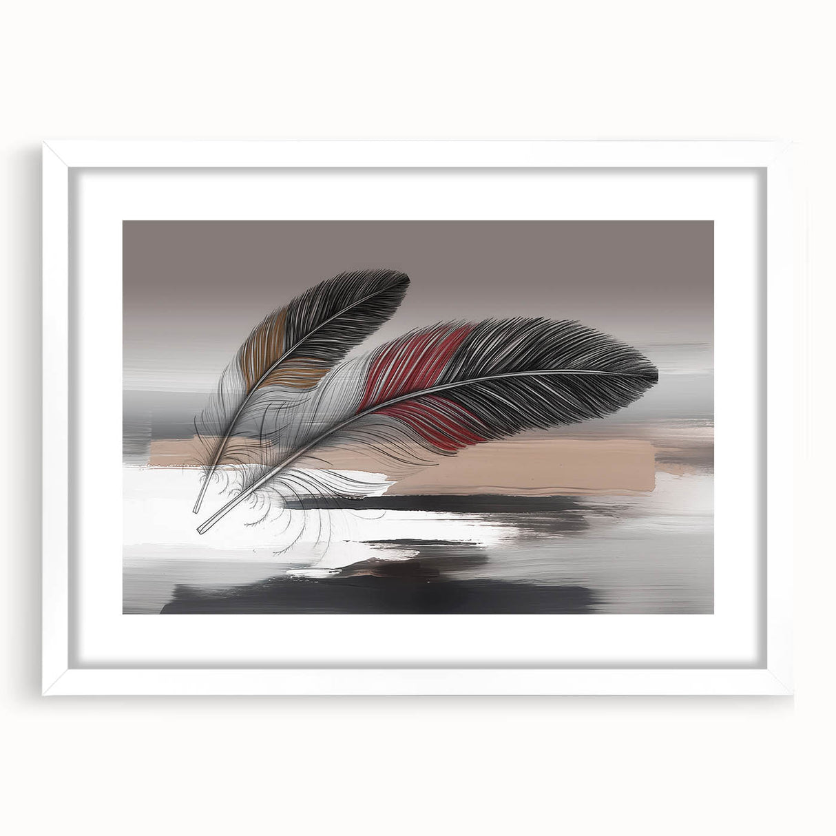 Add a touch of elegance and sophistication to your space with this beautifully detailed abstract feather artwork. Featuring two intricately designed feathers with rich red and brown accents, set against a soft grey and beige background, this piece exudes a sense of calm and refinement. The delicate strokes and subtle color transitions create a harmonious composition that enhances any room's aesthetic.