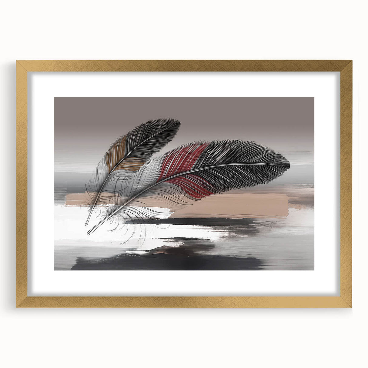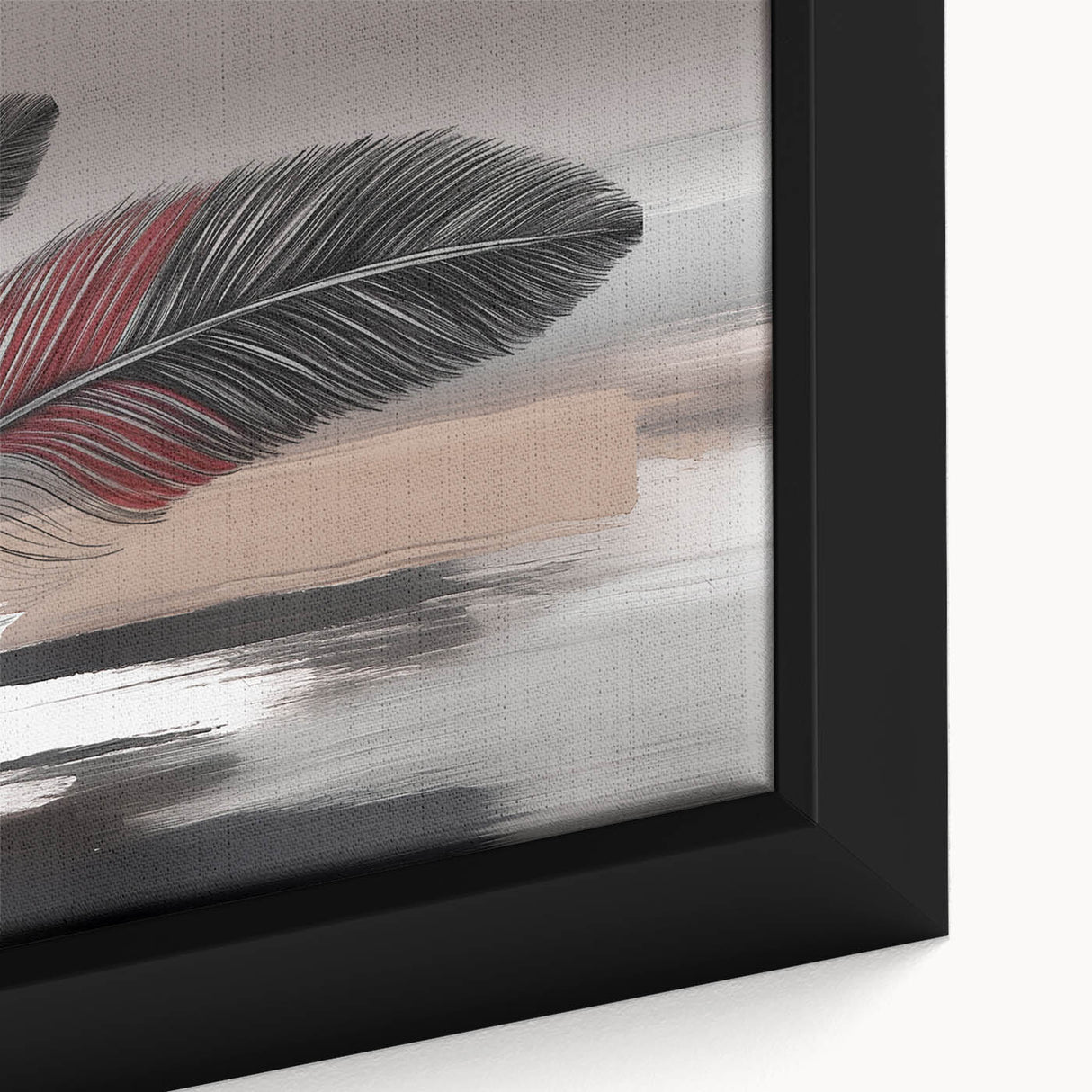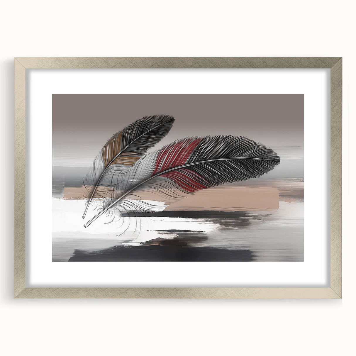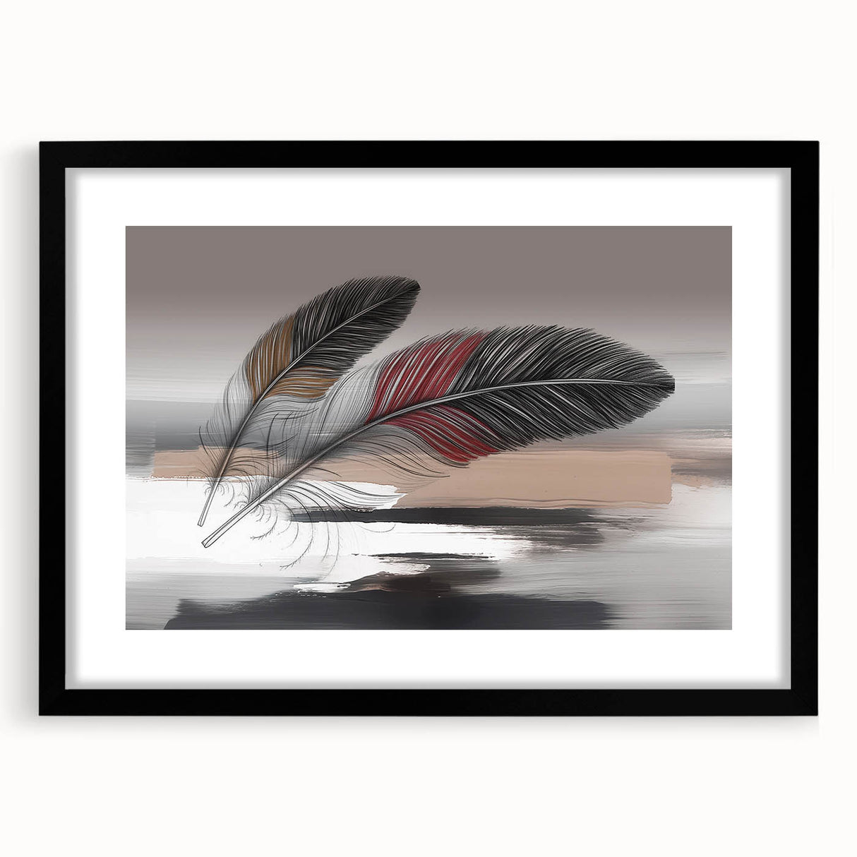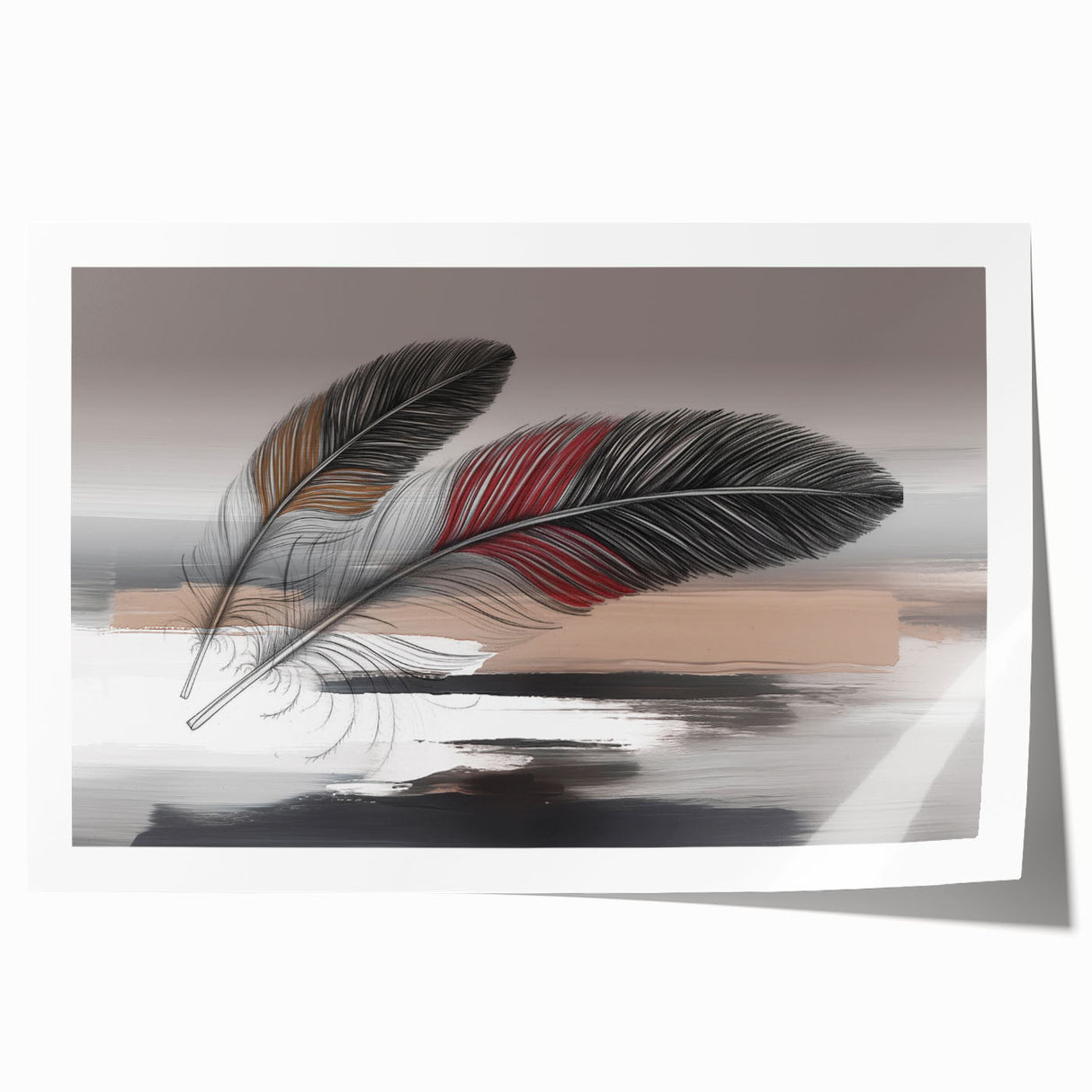 Add a touch of elegance and sophistication to your space with this beautifully detailed abstract feather artwork. Featuring two intricately designed feathers with rich red and brown accents, set against a soft grey and beige background, this piece exudes a sense of calm and refinement. The delicate strokes and subtle color transitions create a harmonious composition that enhances any room's aesthetic.