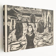Discover the haunting beauty of Edvard Munch's "The Pretenders, The Last Hour," a 1917 masterpiece that captures the depth of human emotion and existential themes. This black-and-white woodcut features striking contrasts and bold, angular lines, depicting a somber group of figures in an enigmatic setting. The central figure's gaze draws viewers into the narrative, evoking questions about mortality, identity, and human connection. Munch's profound Expressionist style makes this piece a powerful addition to any art collection.