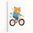 Bring a sense of adventure and fun to your child’s space with this adorable bear on a bicycle wall art. This charming illustration features a happy bear wearing a polka-dot blue sweater and jeans, riding an orange bike with playful heart accents. The warm and inviting colors make it an ideal addition to girls' bedrooms, nurseries, and playrooms, adding a joyful touch to children's wall decor.