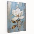 Elevate your home decor with this stunning floral glam wall art, featuring a beautifully textured white flower set against a soft blue and gold background. The delicate petals and rich, earthy tones of the leaves add a sense of elegance and tranquility to any space. This piece effortlessly blends modern sophistication with natural beauty, making it an ideal choice for chic and glam-inspired interiors.