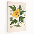 Brighten your space with this vintage botanical illustration of the Gossypium barbadense plant, showcasing a vibrant yellow cotton flower and lush green leaves. The intricate details of the petals, buds, and seeds capture the natural beauty of this iconic plant, making it a perfect choice for nature-inspired decor. Ideal for those who appreciate vintage art style and illustrative botanical designs, this print brings a warm and cheerful touch to any room.