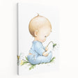 Create a soft and heartwarming atmosphere with this Baby with Flowers nursery wall art. Featuring an adorable baby in a blue onesie, gently holding a delicate flower, this artwork radiates innocence, warmth, and serenity. The gentle pastel tones and watercolor-style illustration make this a perfect choice for baby room decor, children's wall art, and kids' room art prints. Whether you're decorating a nursery, playroom, or a cozy reading nook, this charming print adds a soothing and loving touch.