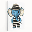 Add a touch of playful charm to your child’s space with this adorable striped blue elephant nursery wall art. Perfect for baby room decor, this illustration features a cute elephant dressed in a black-and-white striped outfit with a matching hat, making it a fun and stylish addition to any nursery or kids’ room.