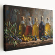 Infuse your kitchen with Mediterranean charm with this exquisite artwork featuring rustic glass bottles filled with golden olive oil, infused herbs, and fresh olives. The rich textures of the wooden surface and the beautifully lit glass bottles create a warm and inviting ambiance, making it a perfect decor piece for food lovers.