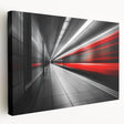 Capture the essence of speed and modern minimalism with this Minimalist Landscape Artwork featuring a striking red train rushing through a sleek, contemporary subway station. The contrast of black, white, and gray tones with the vivid motion blur of red creates a Modern Nature Wall Decor piece perfect for urban aesthetics.