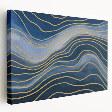 • Abstract wall art featuring vibrant strokes and lines in shades of blue, gold, and black on stretched canvas, ideal for modern decor.