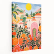 Immerse your space in the bold vibrancy of maximalism with this eclectic wall art piece, showcasing a stunning citrus grove against a backdrop of colorful architecture and a radiant sun. This design masterfully blends warm oranges, lush greens, and soft pinks to create a striking composition, perfect for anyone looking to make a statement in their home decor.