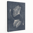 Enhance your decor with this beautiful Mid-Century Modern Art piece featuring a minimalist ginkgo leaf design. The delicate white linework on a deep navy blue background adds a touch of elegance, embodying the spirit of retro-inspired and geometric wall decor. This artwork is perfect for creating a calming and sophisticated atmosphere in any living room, bedroom, or office.