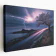 Capture the power of nature with this breathtaking fine art photography print. A dramatic lightning strike illuminates the stormy sky, while a lone cherry blossom tree stands resilient beside a winding road. The deep hues of midnight blues and purples contrast beautifully with the fiery red light trails, creating a scene filled with energy and movement.