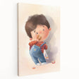 Add warmth and nostalgia to your child’s space with this charming boy nursery canvas print. This beautifully illustrated children’s wall art features a young boy in denim overalls, enjoying a snack with a soft and dreamy background. The warm beige, blue, and brown tones make it a comforting and stylish baby room decor choice.