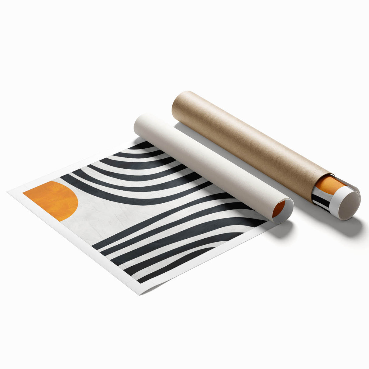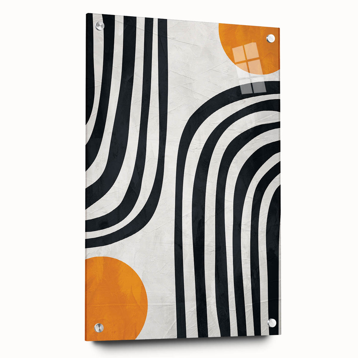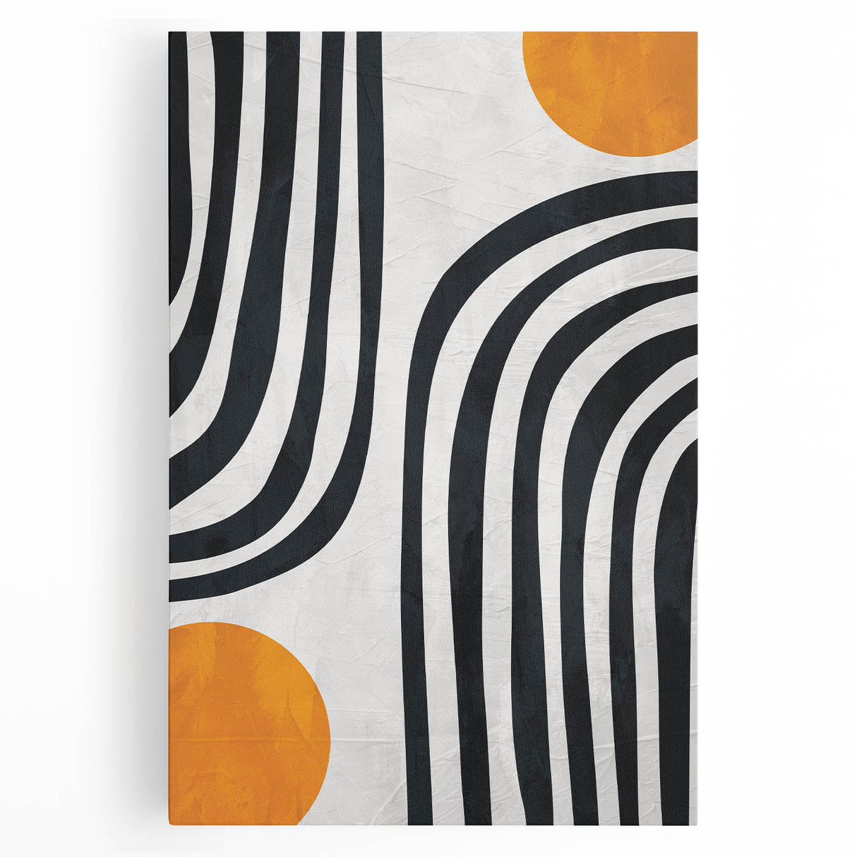 Make a statement with this geometric abstract painting, featuring bold black curving lines intertwined with vibrant orange circles on a neutral background. The contrast between structured lines and fluid motion creates a modern and eye-catching aesthetic, making this contemporary canvas print ideal for those who appreciate dynamic design. Whether placed in a living room, hallway, or office, this piece enhances your space with energy and movement.
