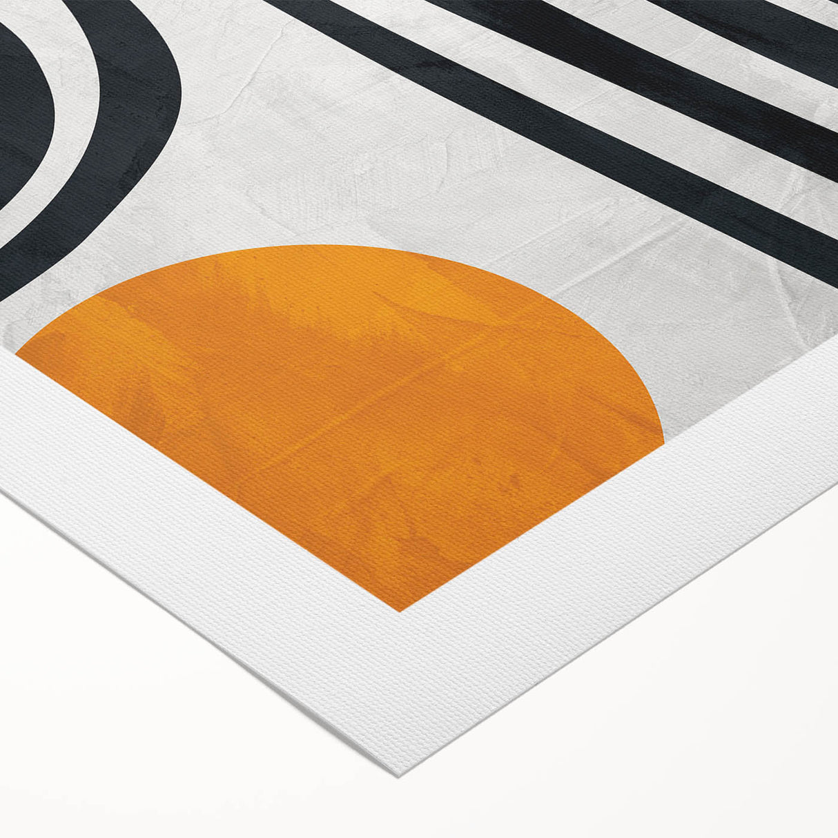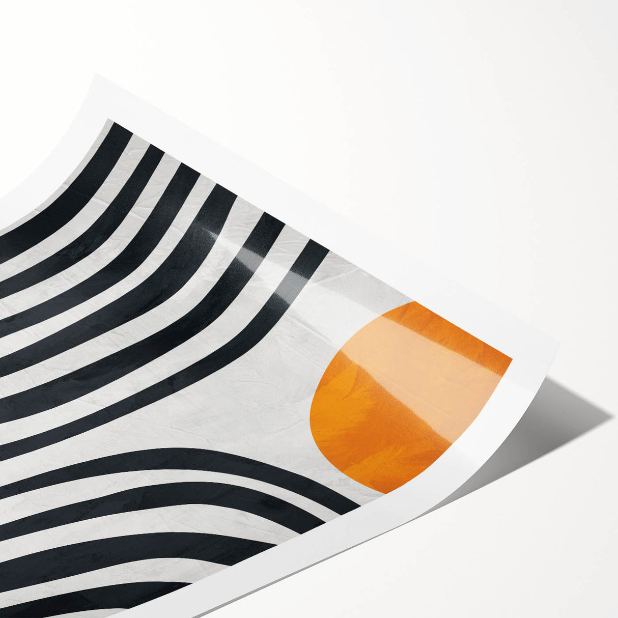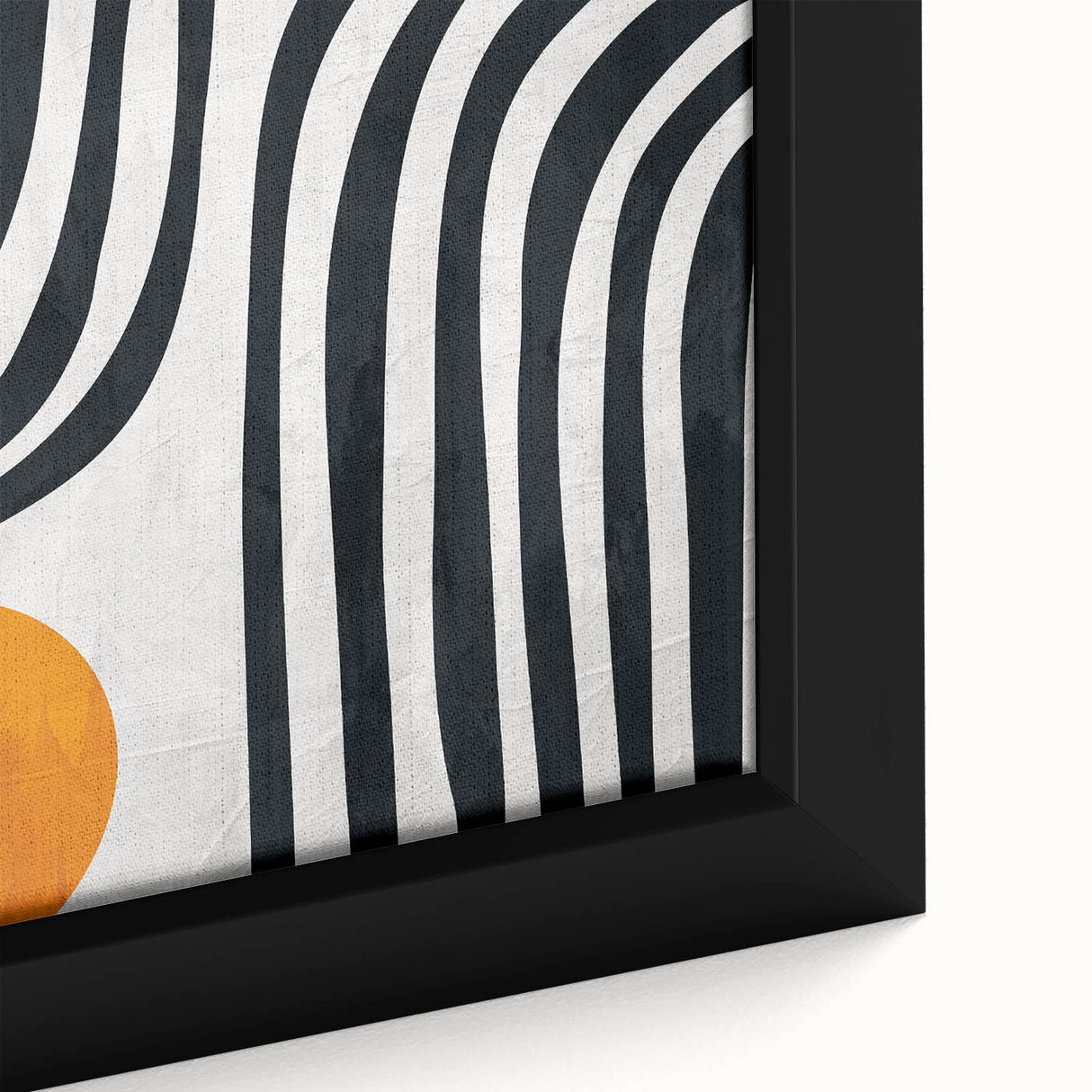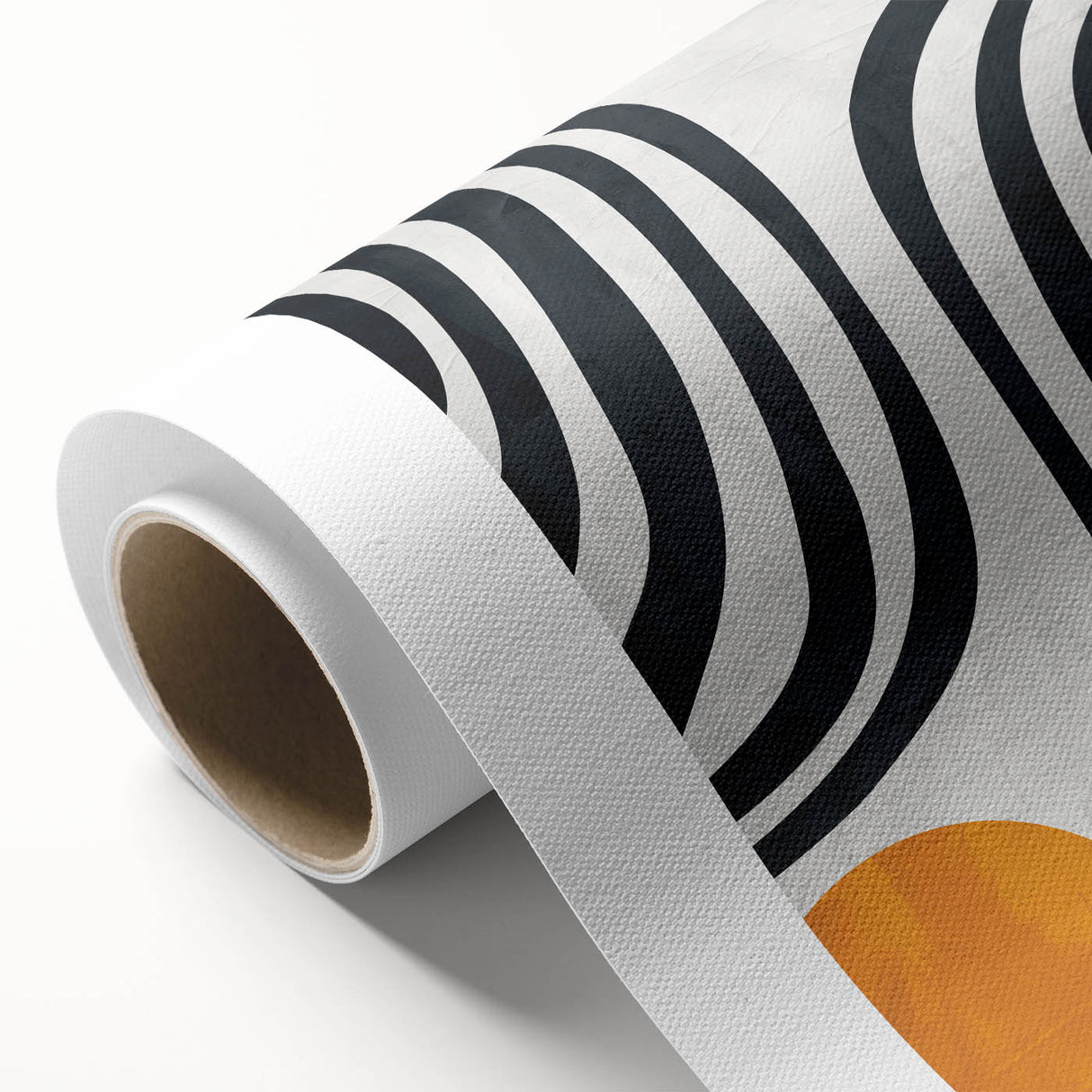 Make a statement with this geometric abstract painting, featuring bold black curving lines intertwined with vibrant orange circles on a neutral background. The contrast between structured lines and fluid motion creates a modern and eye-catching aesthetic, making this contemporary canvas print ideal for those who appreciate dynamic design. Whether placed in a living room, hallway, or office, this piece enhances your space with energy and movement.