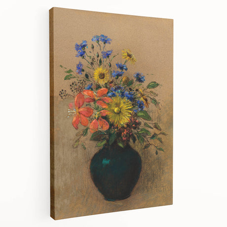 • Abstract floral wall art on stretched canvas showcasing vibrant colors in a contemporary design. Side view highlights the textured surface and frame depth, perfect for modern decor.