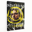 Capture the essence of grunge with this Pop Art Wall Art featuring Kurt Cobain. Dominated by bold shades of yellow, black, and white, this artwork pays homage to the legendary frontman of Nirvana. The graffiti-style text, iconic smiley face, and raw aesthetic bring a nostalgic yet modern twist to your space, making it a must-have for music lovers and art enthusiasts alike.