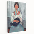 Introduce elegance and emotion to your decor with this modern wall art piece, featuring an abstract portrait of a gypsy woman holding a baby. This contemporary art by Amedeo Modigliani showcases a unique blend of soft gray tones, vivid coral reds, and gentle pastel blues, making it a stunning addition to both modern and minimalist interiors. The clean lines and expressive composition offer a timeless charm that draws attention and admiration.