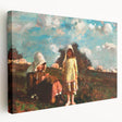 Experience the rustic charm of "Two Girls with Sunbonnets in a Field" by Winslow Homer, a beautiful example of Realism capturing the quiet, pastoral life of the late 19th century. This painting portrays two young girls in a serene meadow, surrounded by grazing sheep under a vast sky. The warm, earthy tones combined with vibrant greens and blues make this art print a delightful addition to any decor that values nature and simplicity.